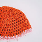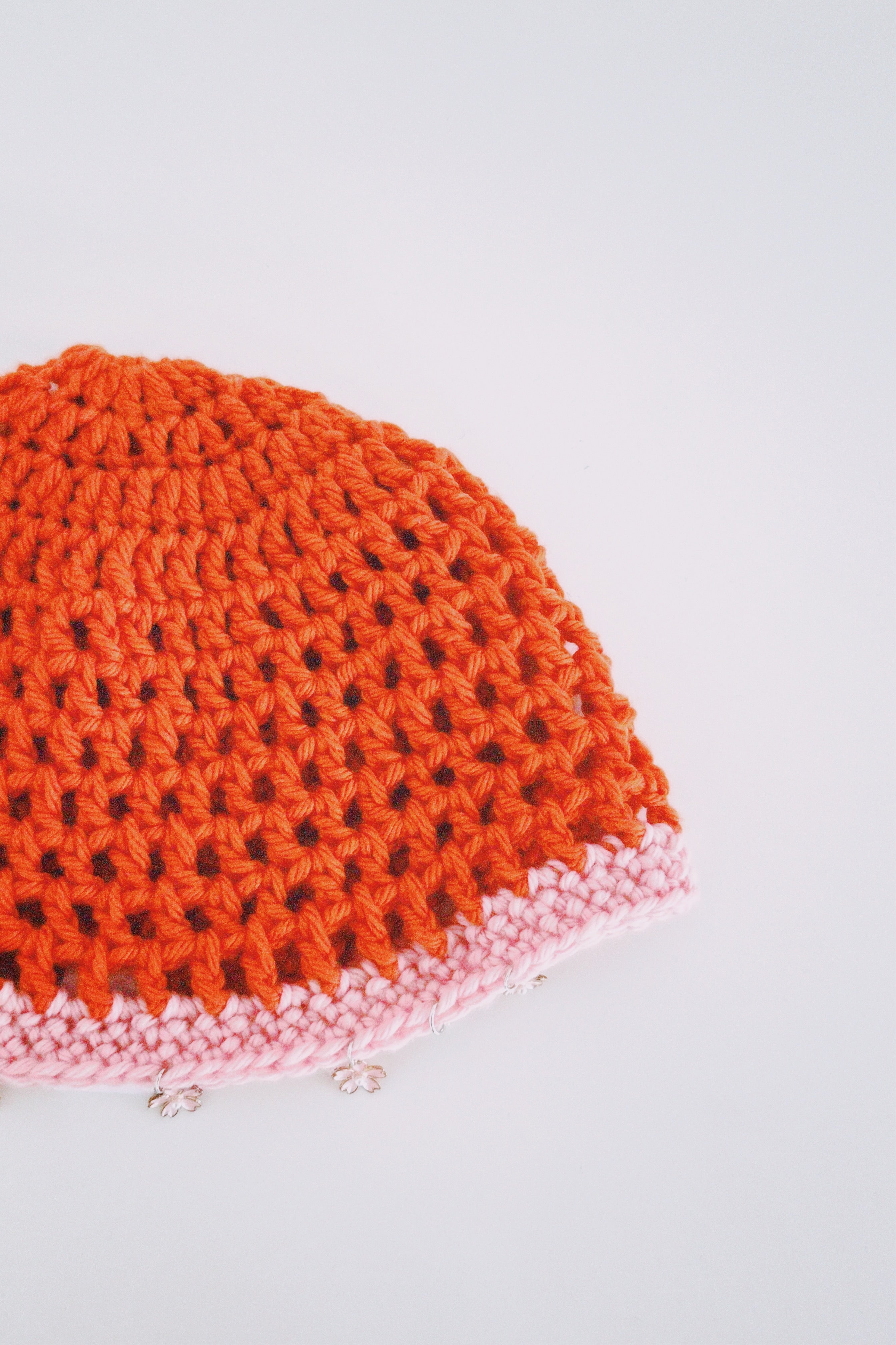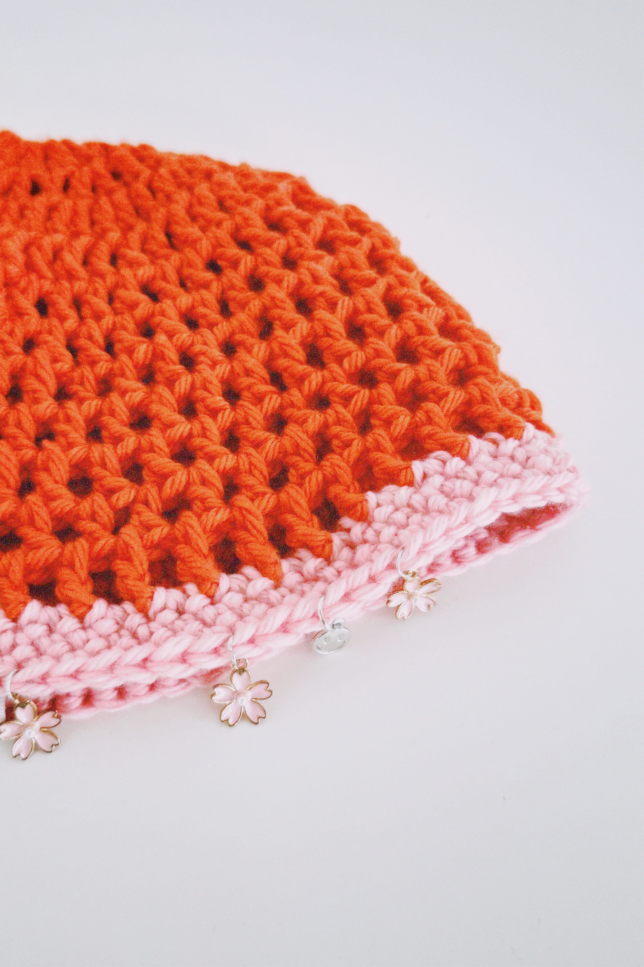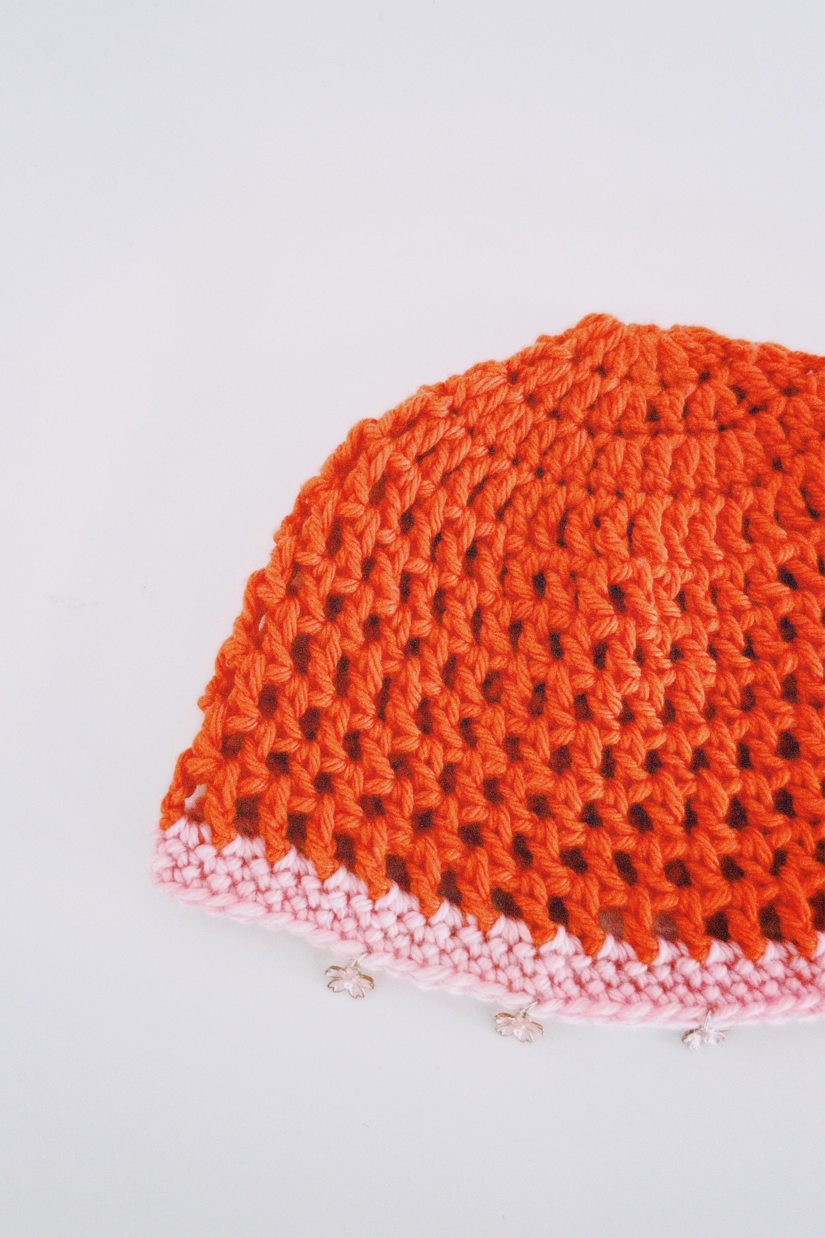 This crochet hat in vibrant orange is accented with a soft pink border and delicate flower details. Lightweight yet cozy, it's a playful and unique accessory, perfect for brightening up a cool day while adding a touch of handmade charm to your outfit.