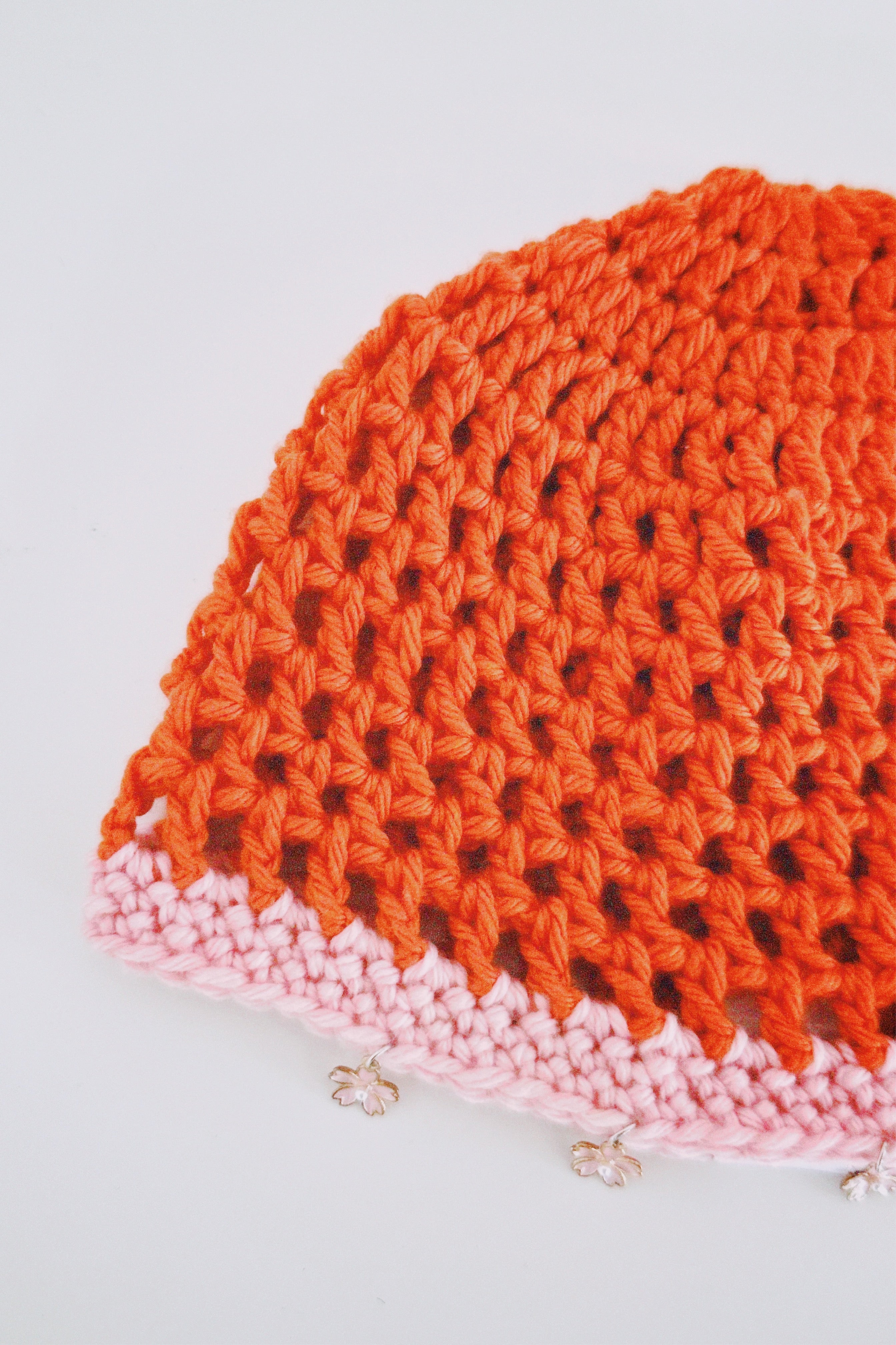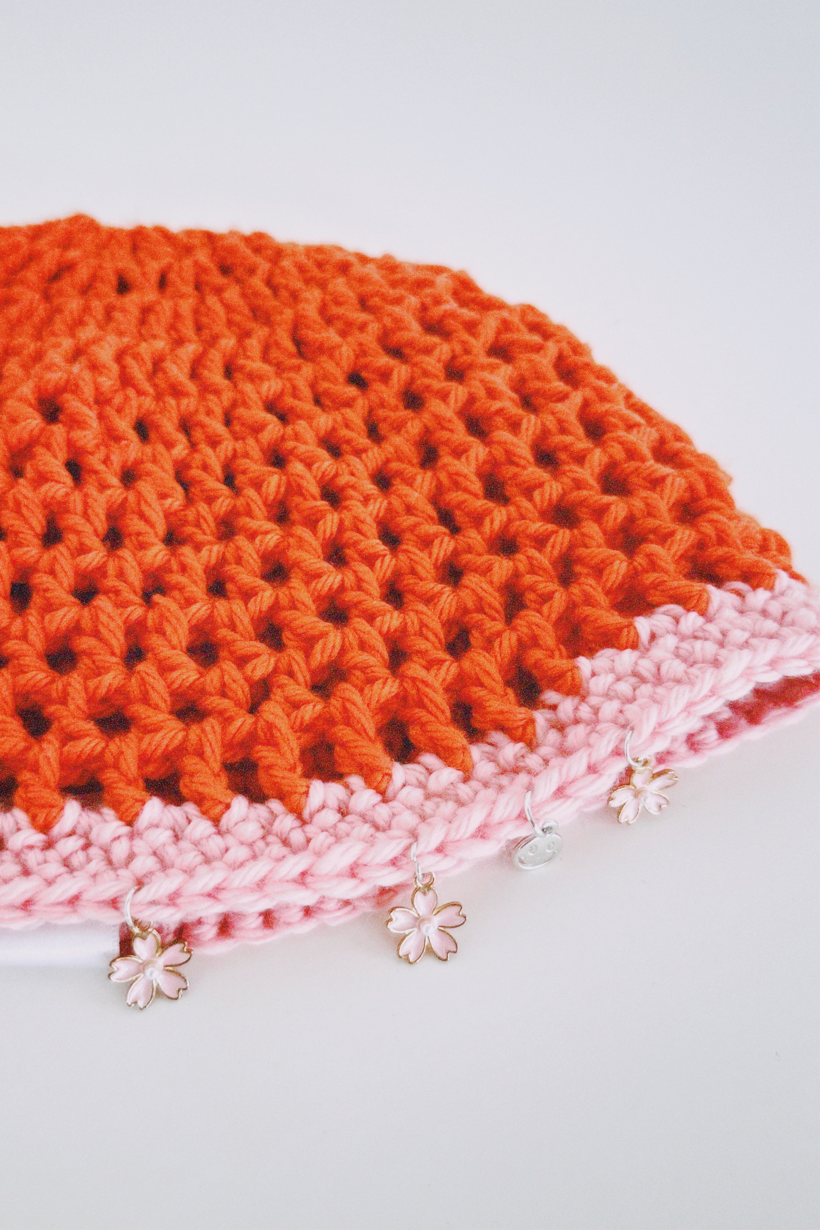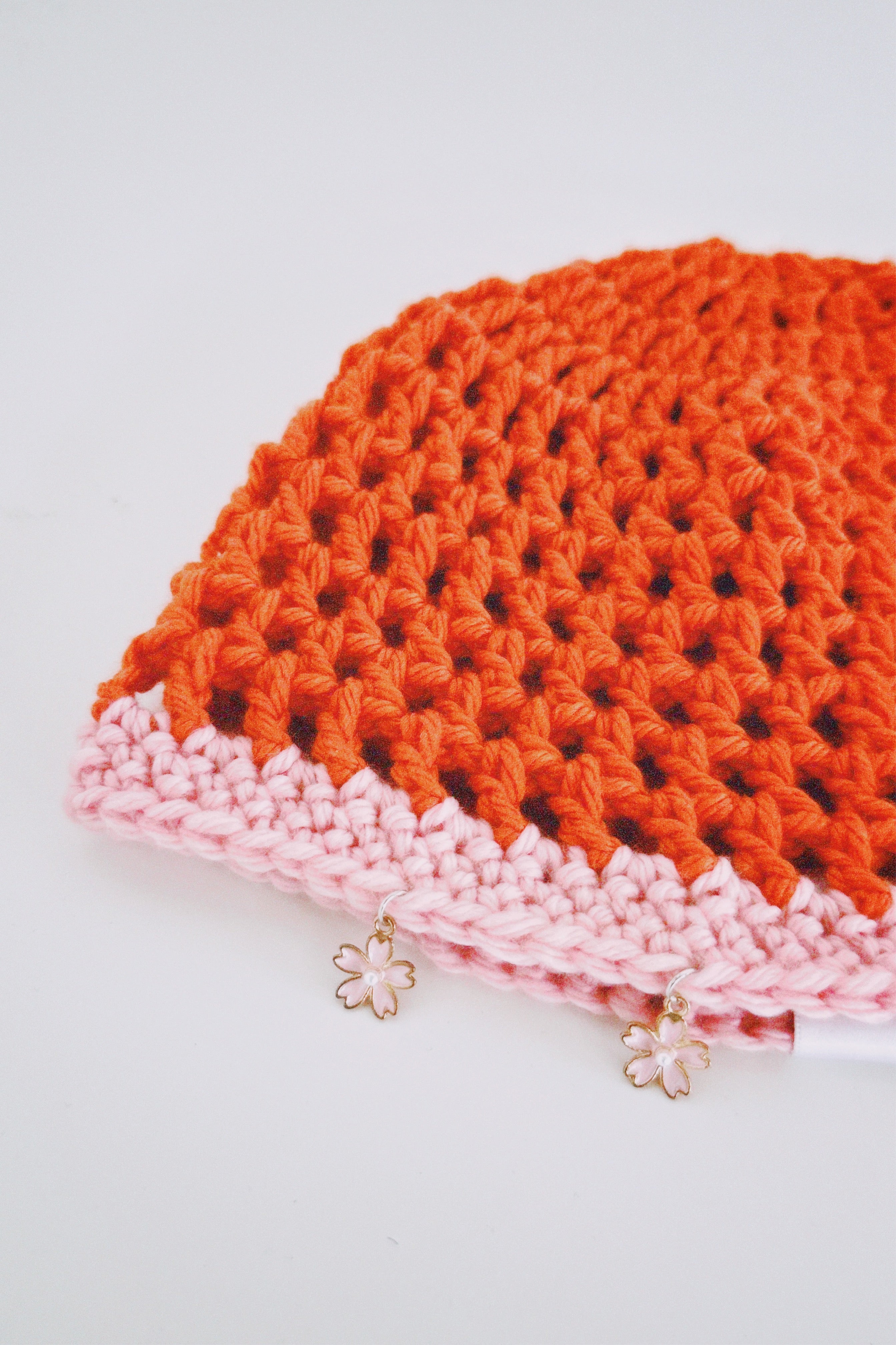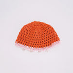 This crochet hat in vibrant orange is accented with a soft pink border and delicate flower details. Lightweight yet cozy, it's a playful and unique accessory, perfect for brightening up a cool day while adding a touch of handmade charm to your outfit.