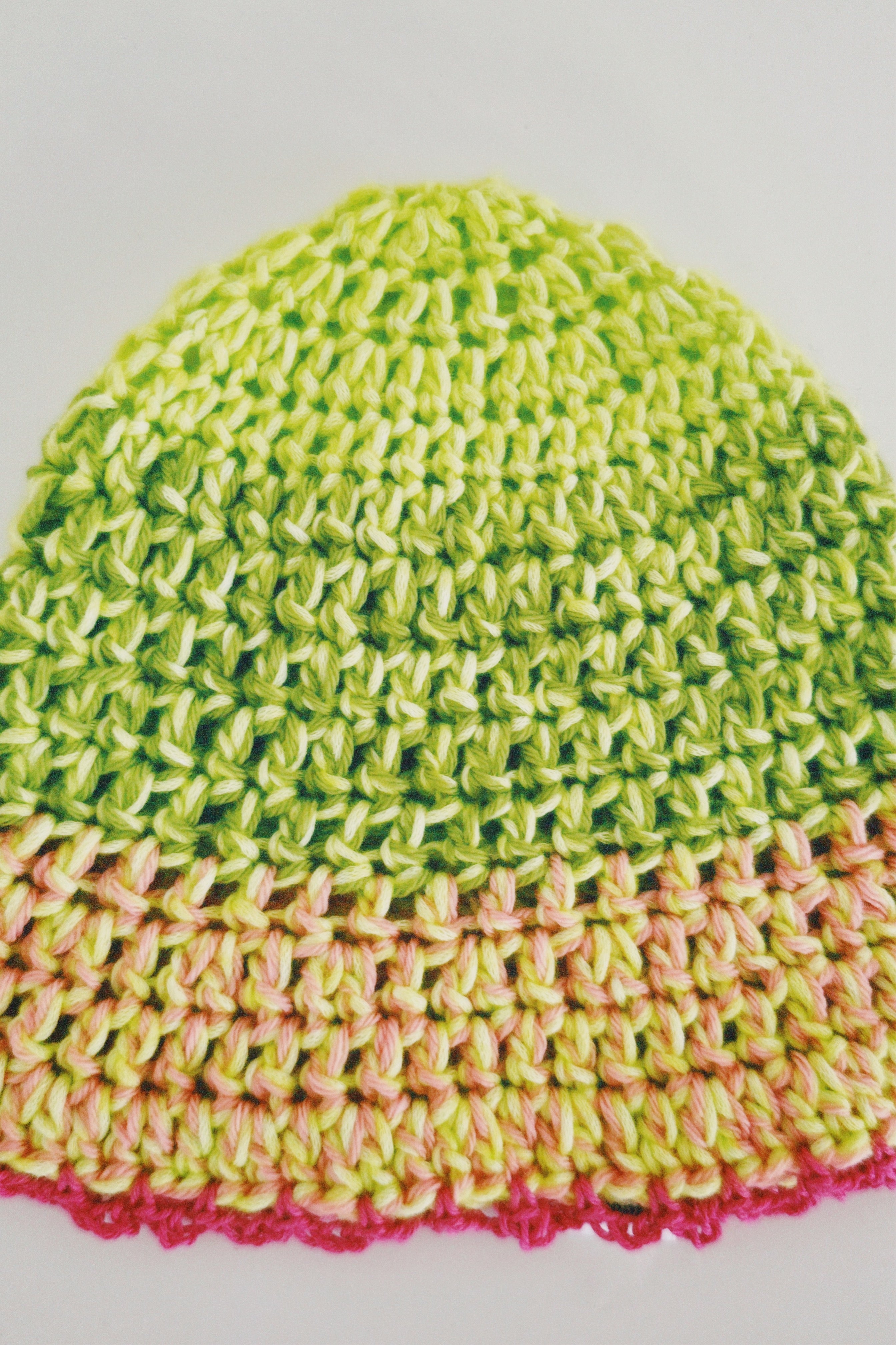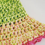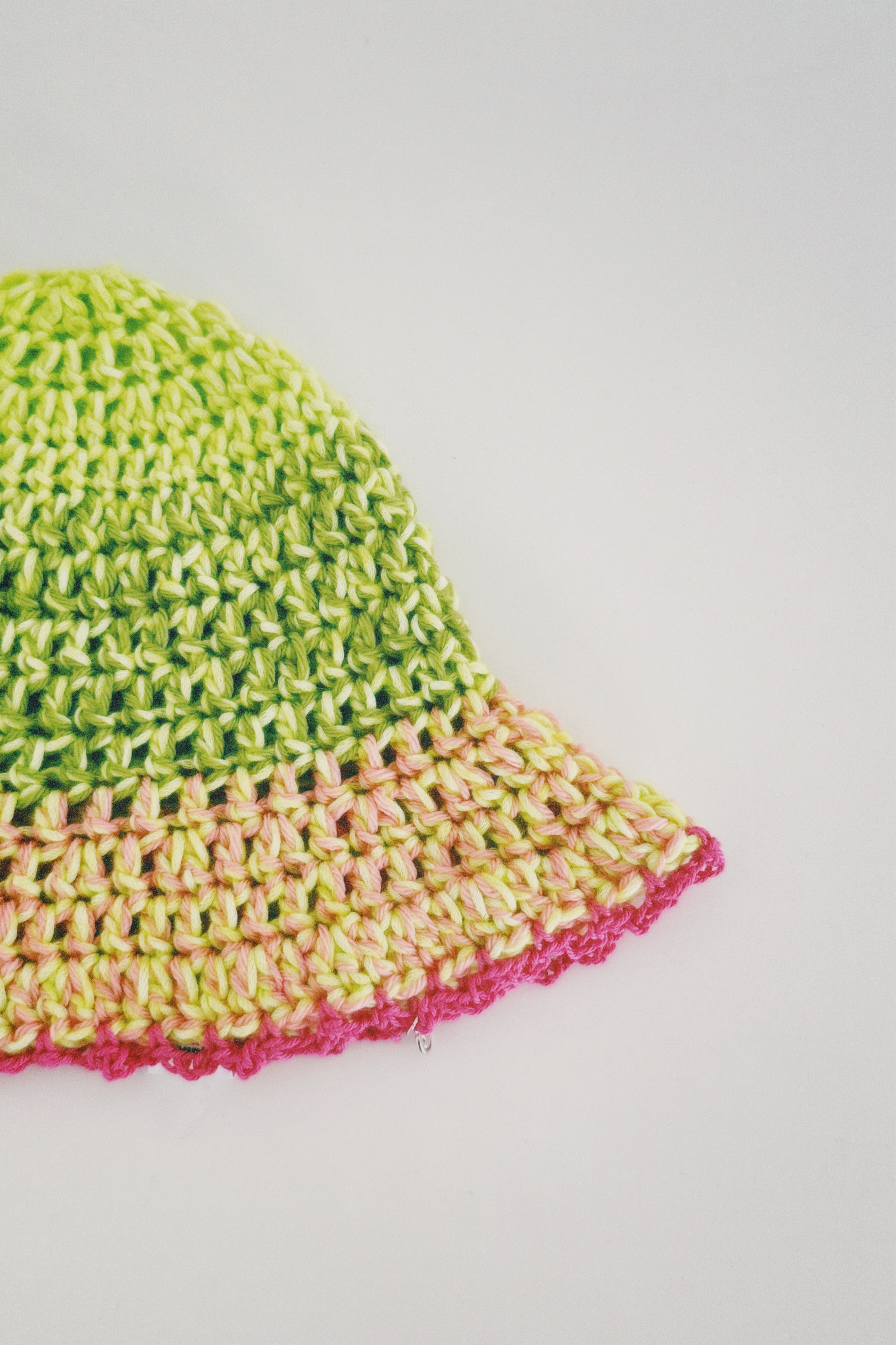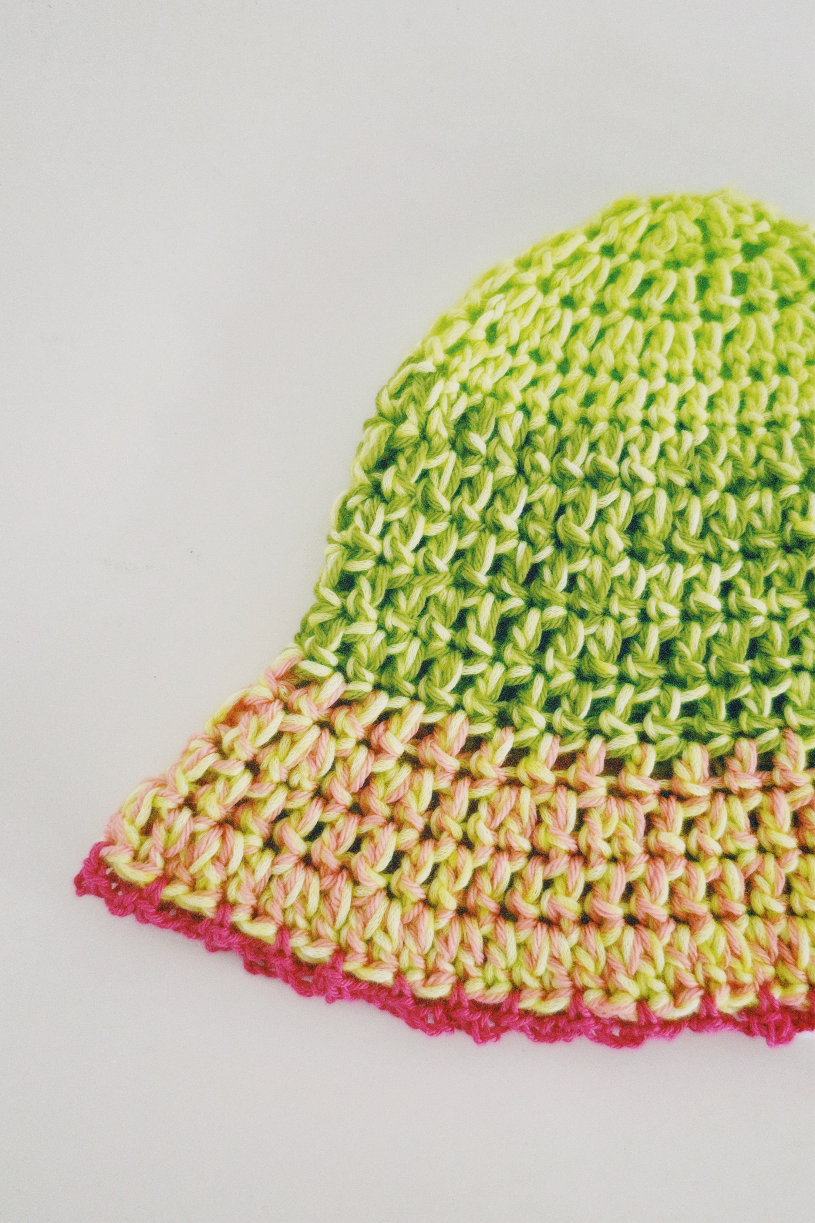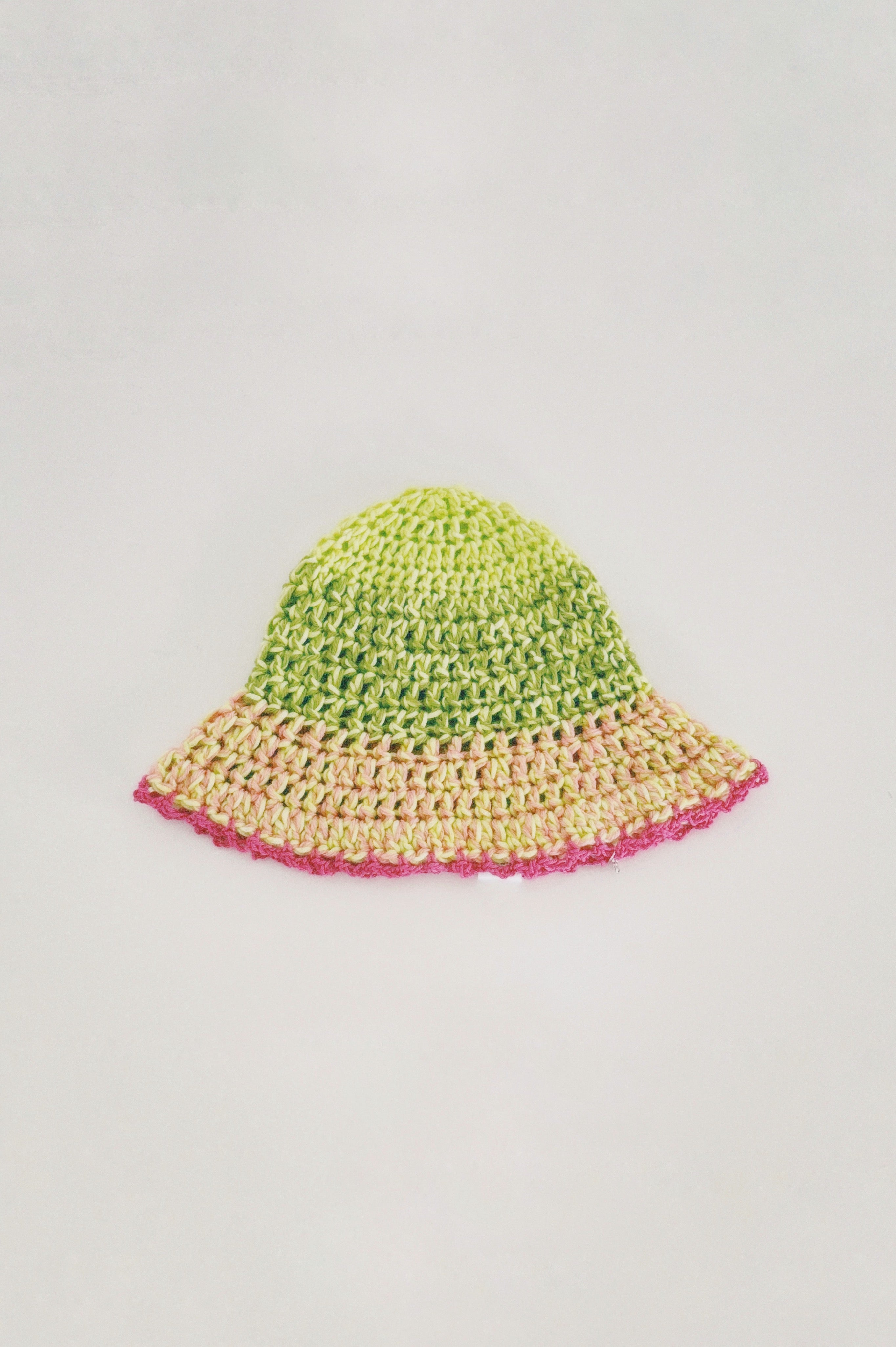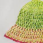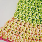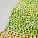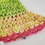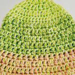 This crochet hat features a refreshing blend of vibrant greens, soft peach, and a pop of pink on the brim. Its open-crochet stitch design is perfect for warm weather, adding a playful touch to any outfit while keeping you cool and comfortable. Ideal for sunny days and casual outings.