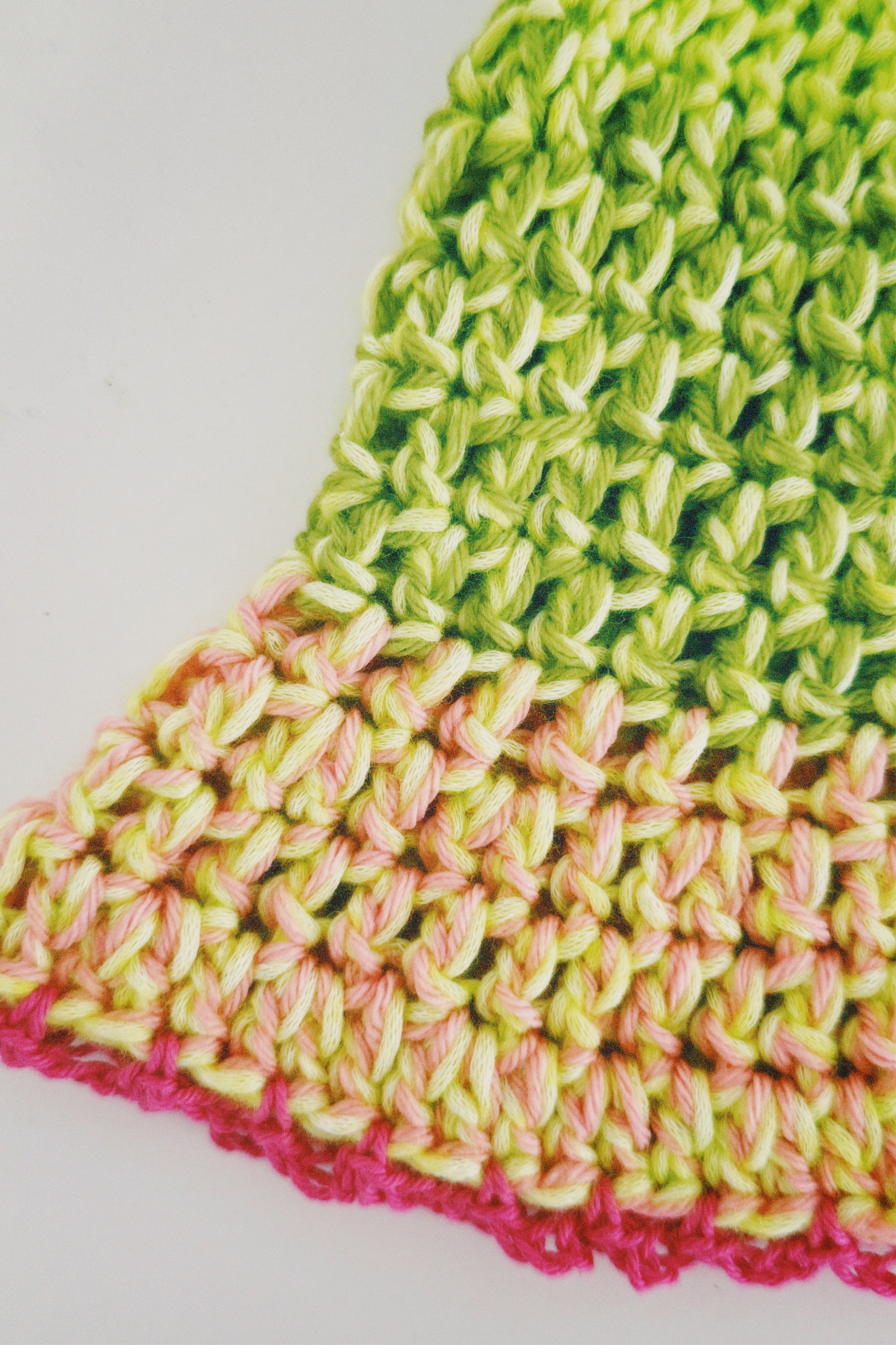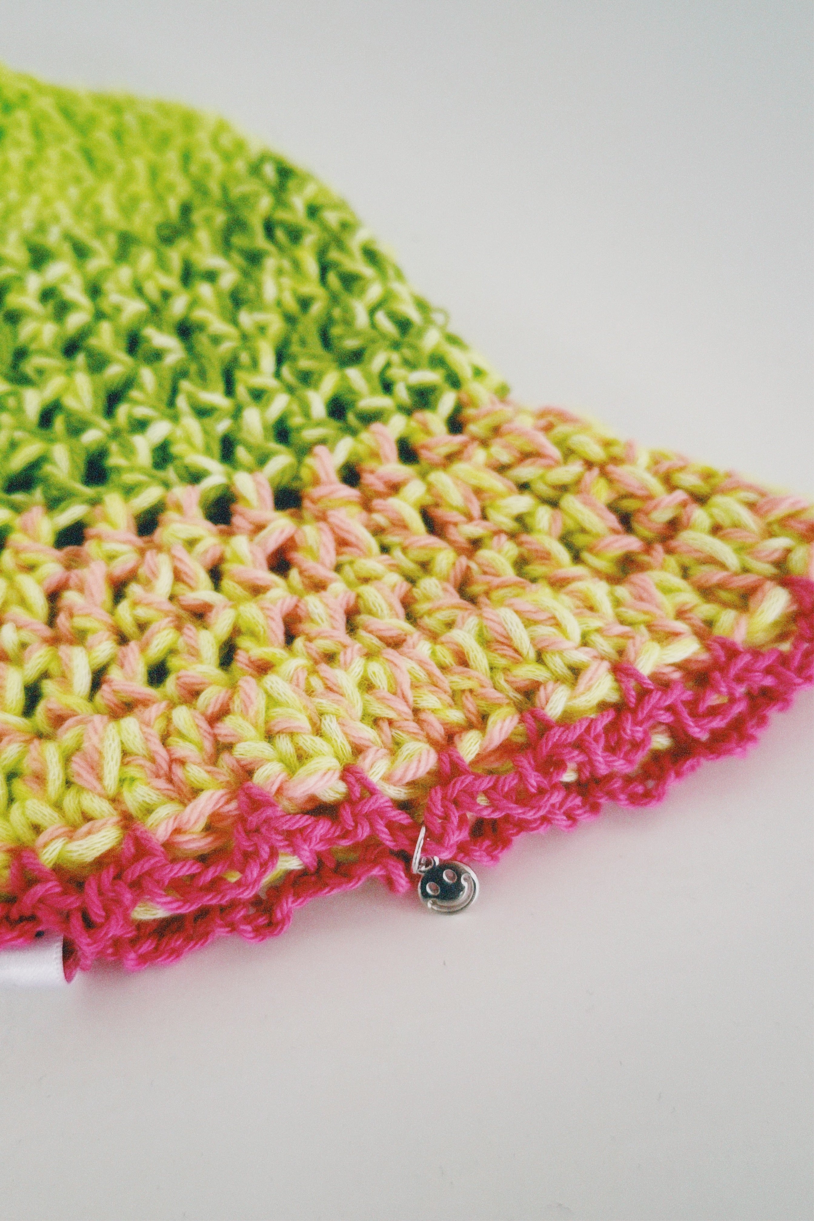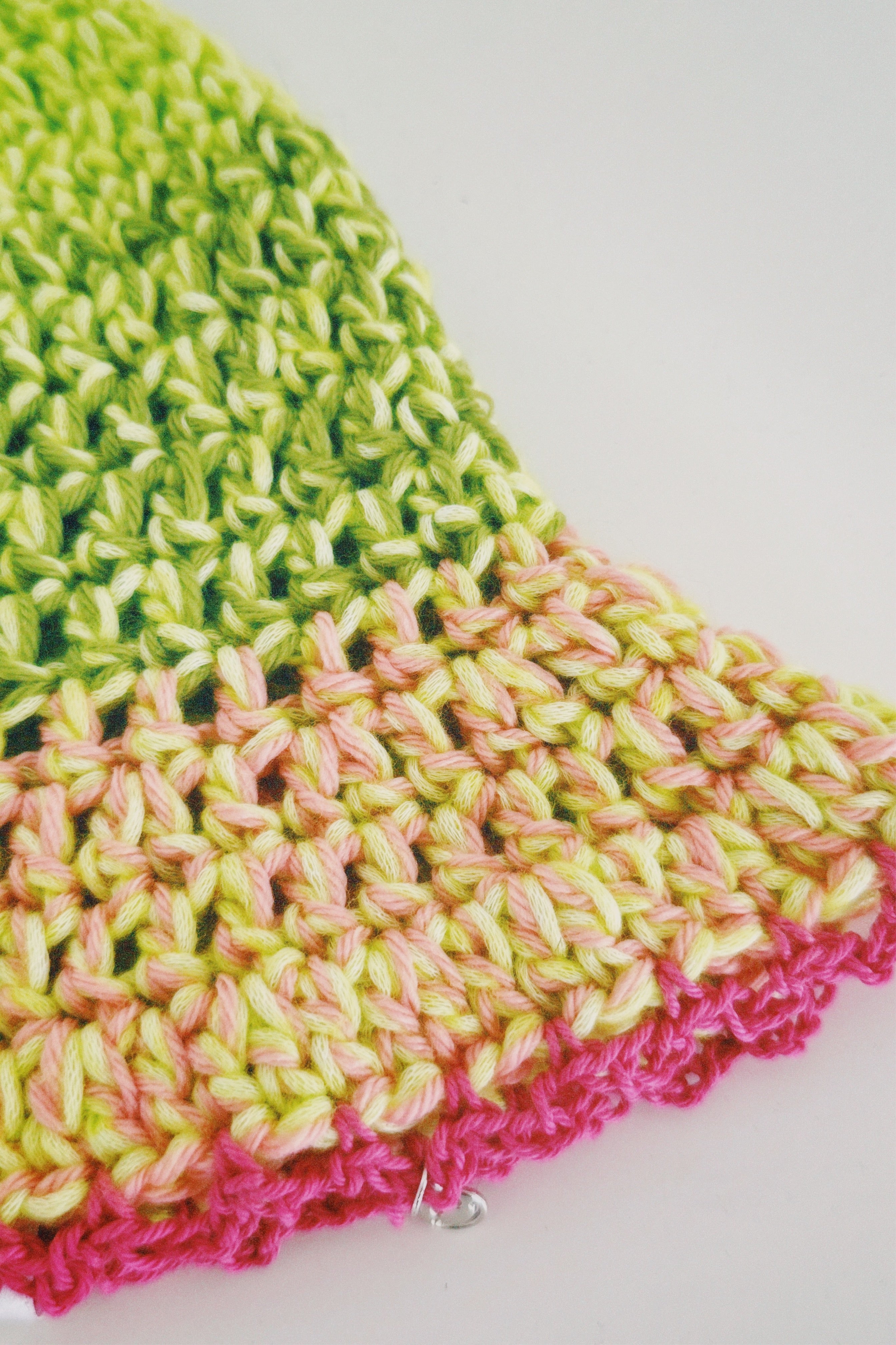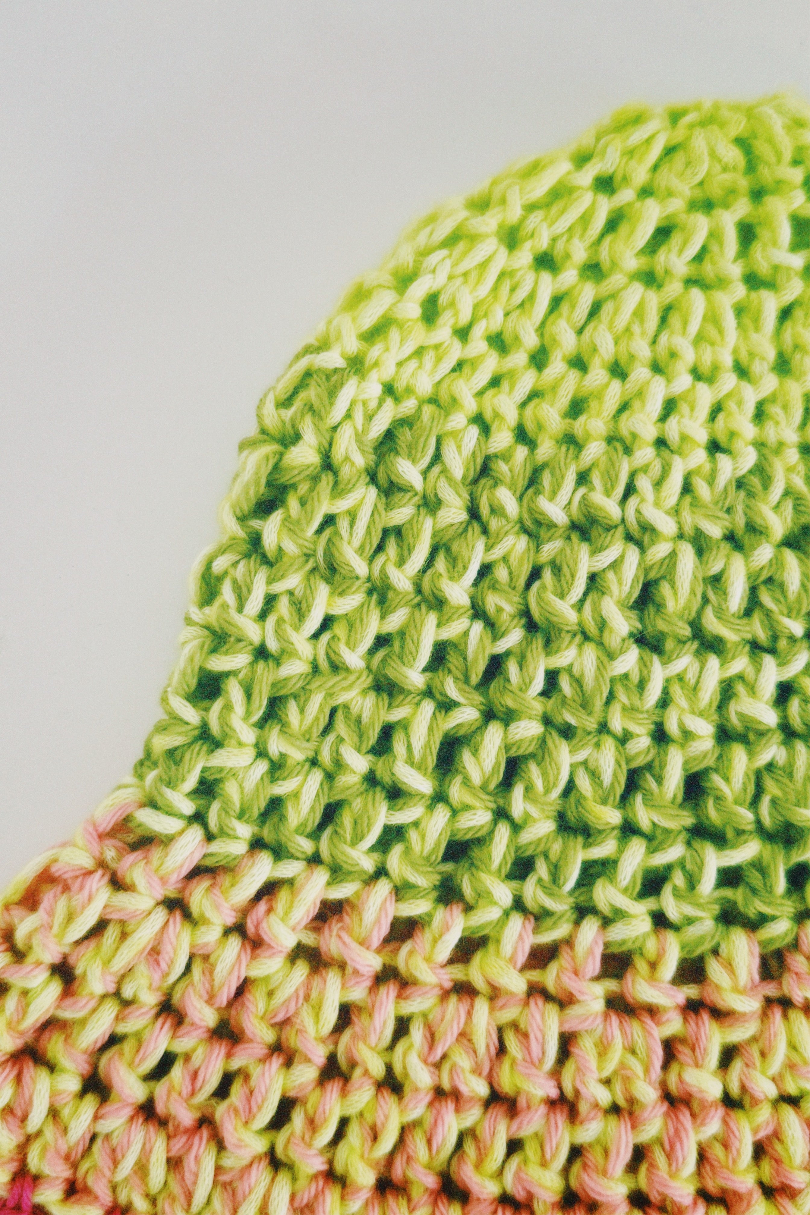 This crochet hat features a refreshing blend of vibrant greens, soft peach, and a pop of pink on the brim. Its open-crochet stitch design is perfect for warm weather, adding a playful touch to any outfit while keeping you cool and comfortable. Ideal for sunny days and casual outings.