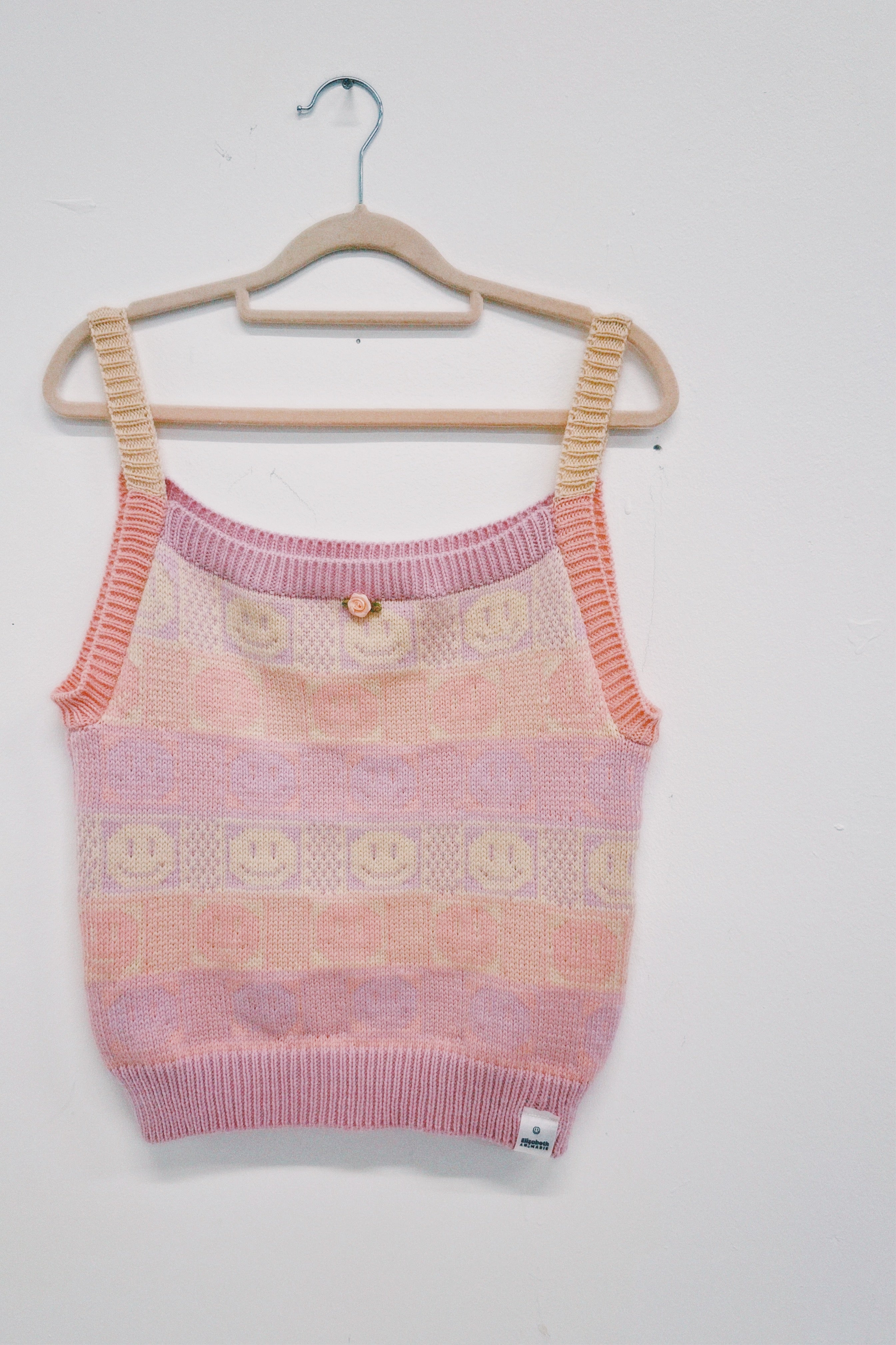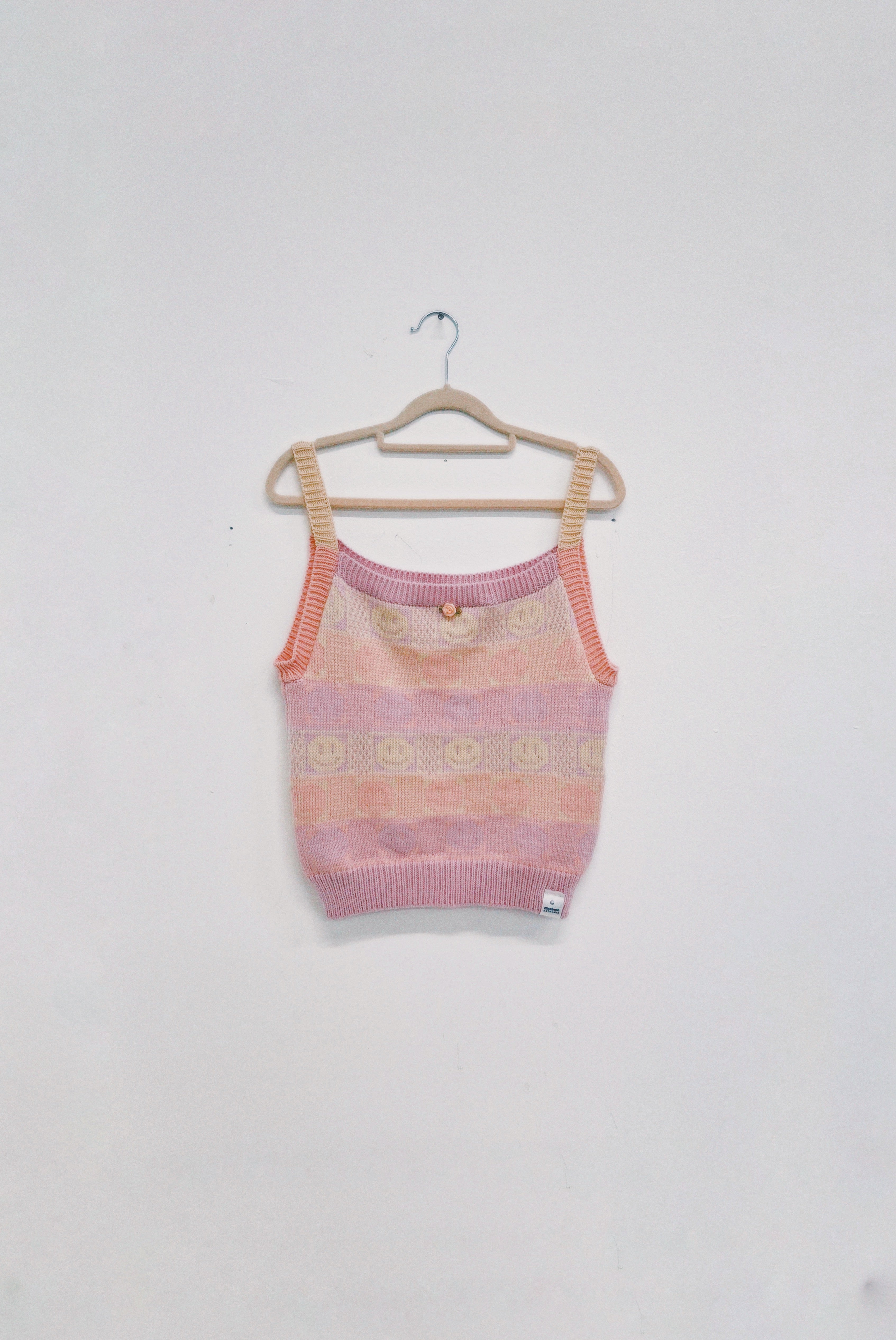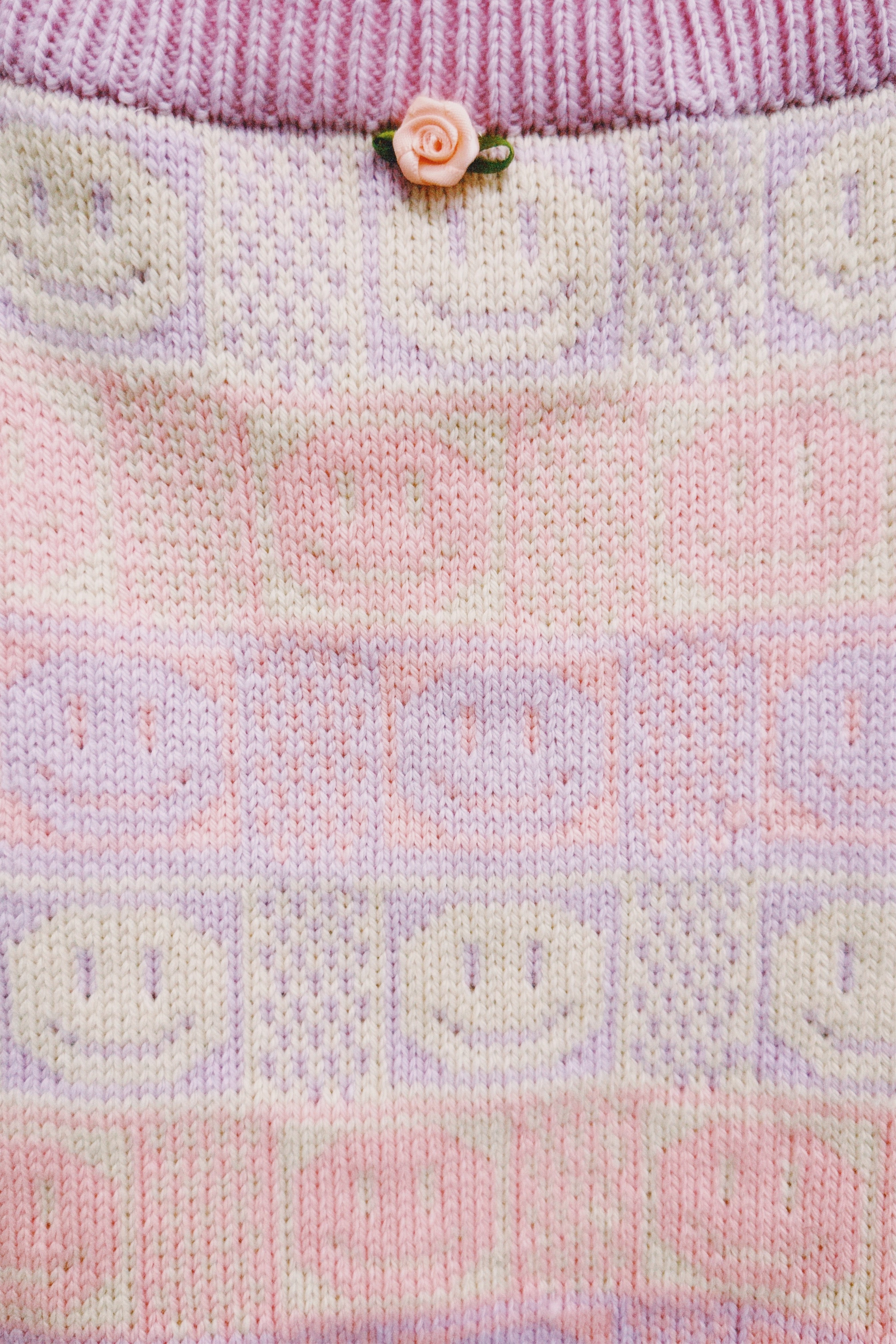 Smiley Checkerboard knit tops, made using 100% merino yarn. Soft and breathable, perfect for any weather. Made to order in a range of sizes. Machine washable for easy care. Adds a playful touch to any outfit.