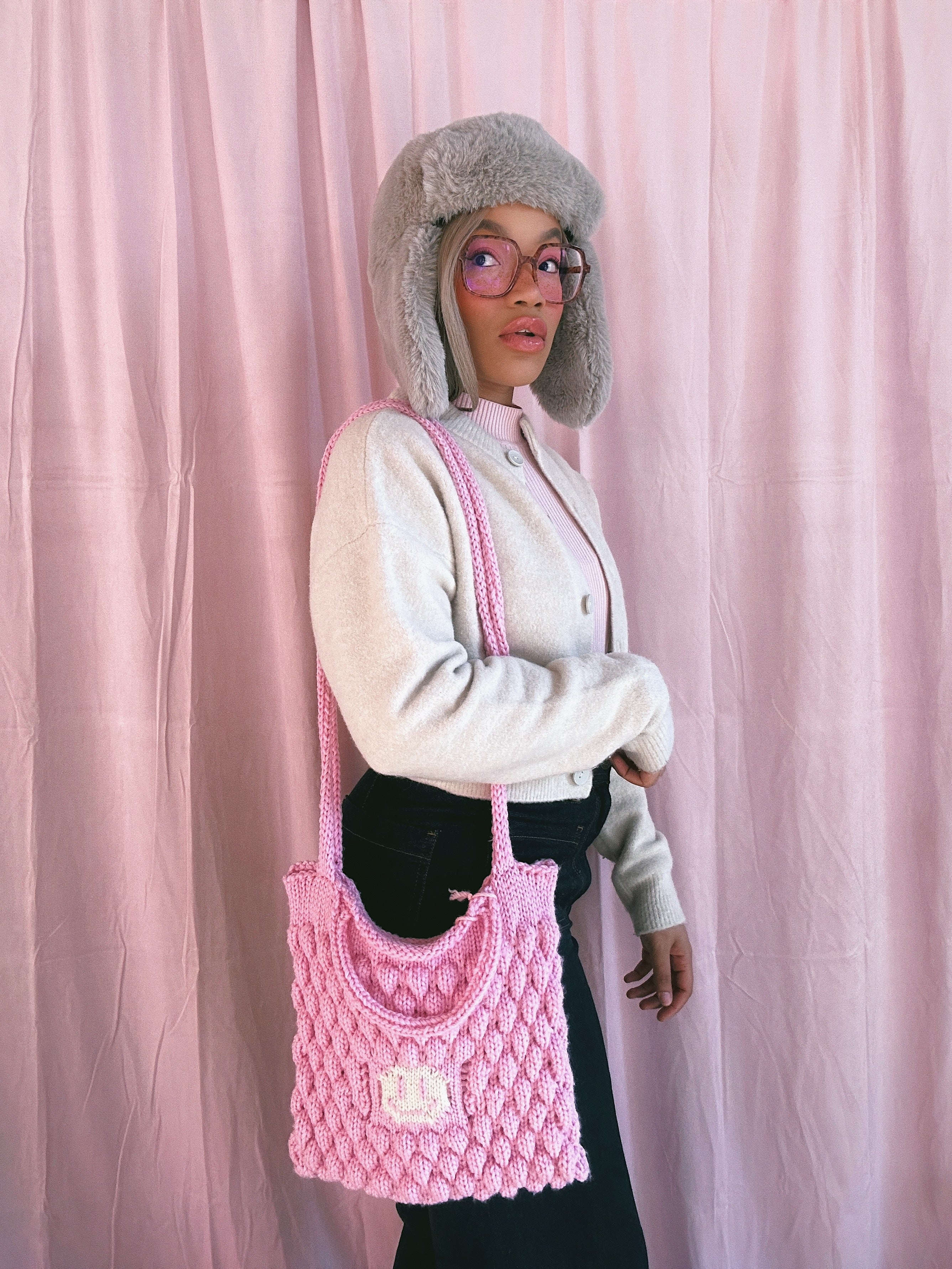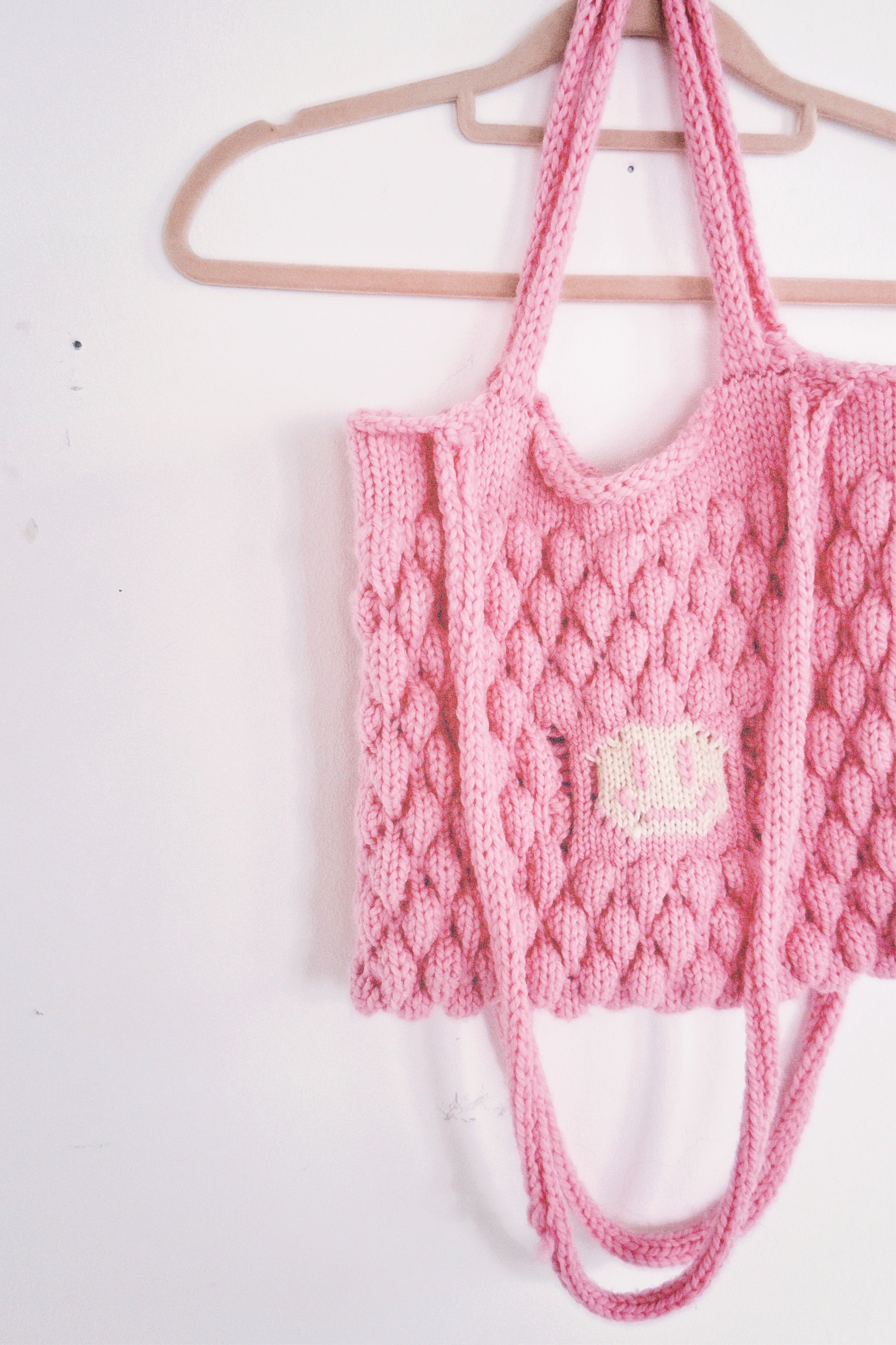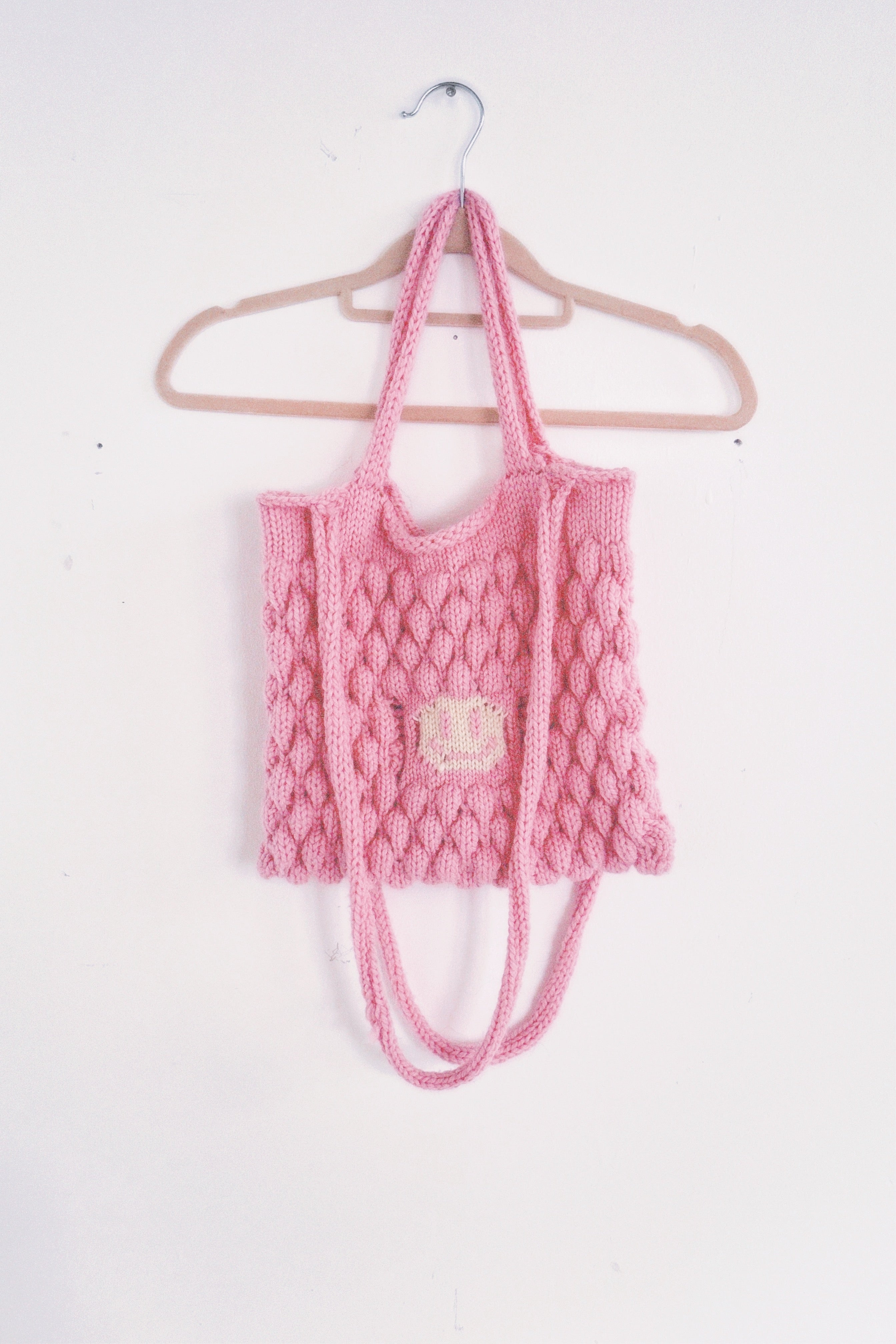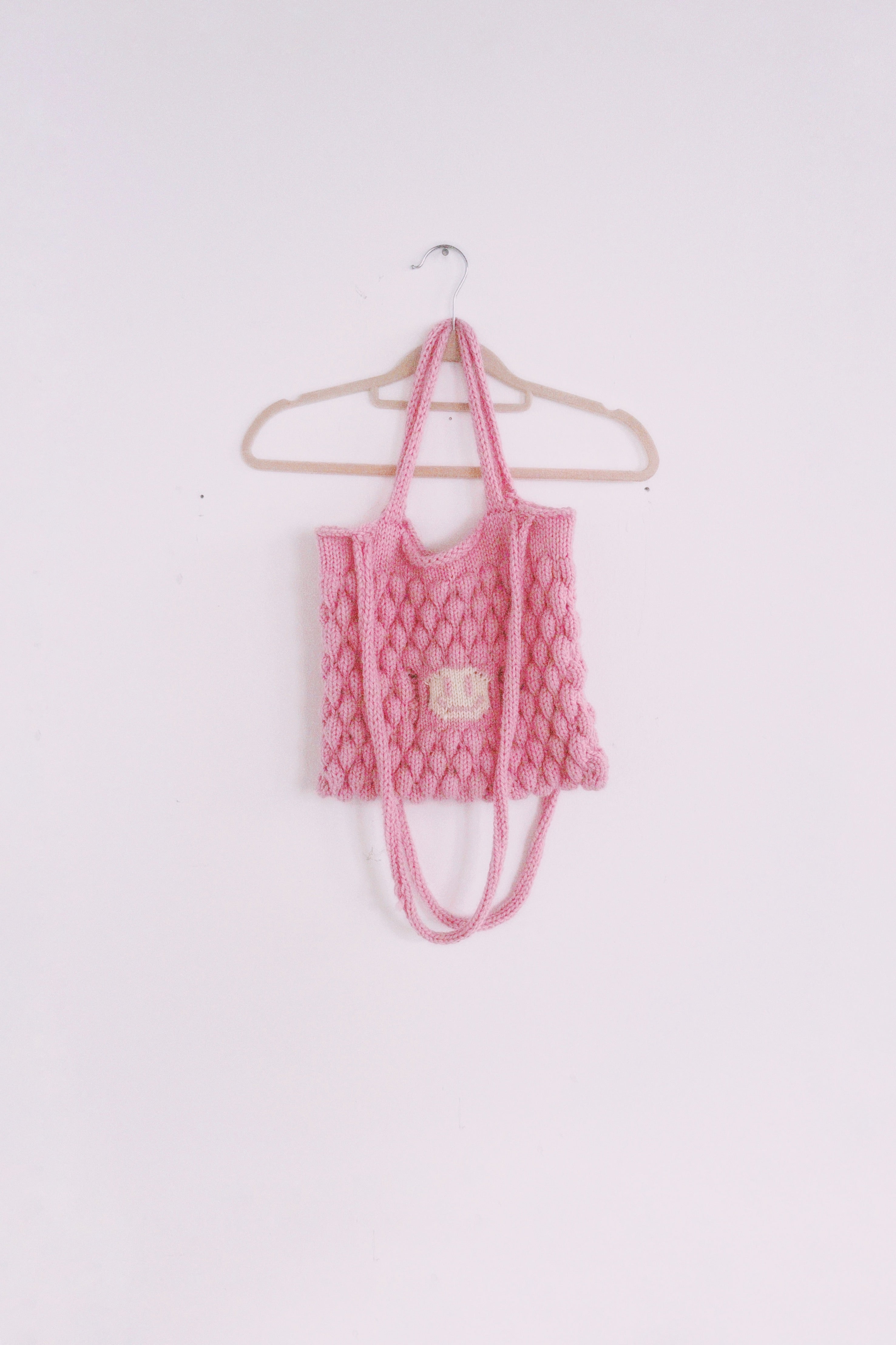 This adorable pink knit tote bag is a delightful blend of style and function, perfect for adding a pop of color to any outfit. Featuring a charming textured pattern and a signature smiley face motif, it radiates cheerfulness and warmth. With sturdy knit handles and an extra-long strap option, this bag offers versatile carrying options for comfort and convenience. Spacious enough for your daily essentials, it’s ideal for errands, casual outings, or even as a stylish accessory for a cozy look. A must-have for those who love playful, unique pieces!