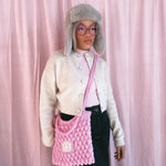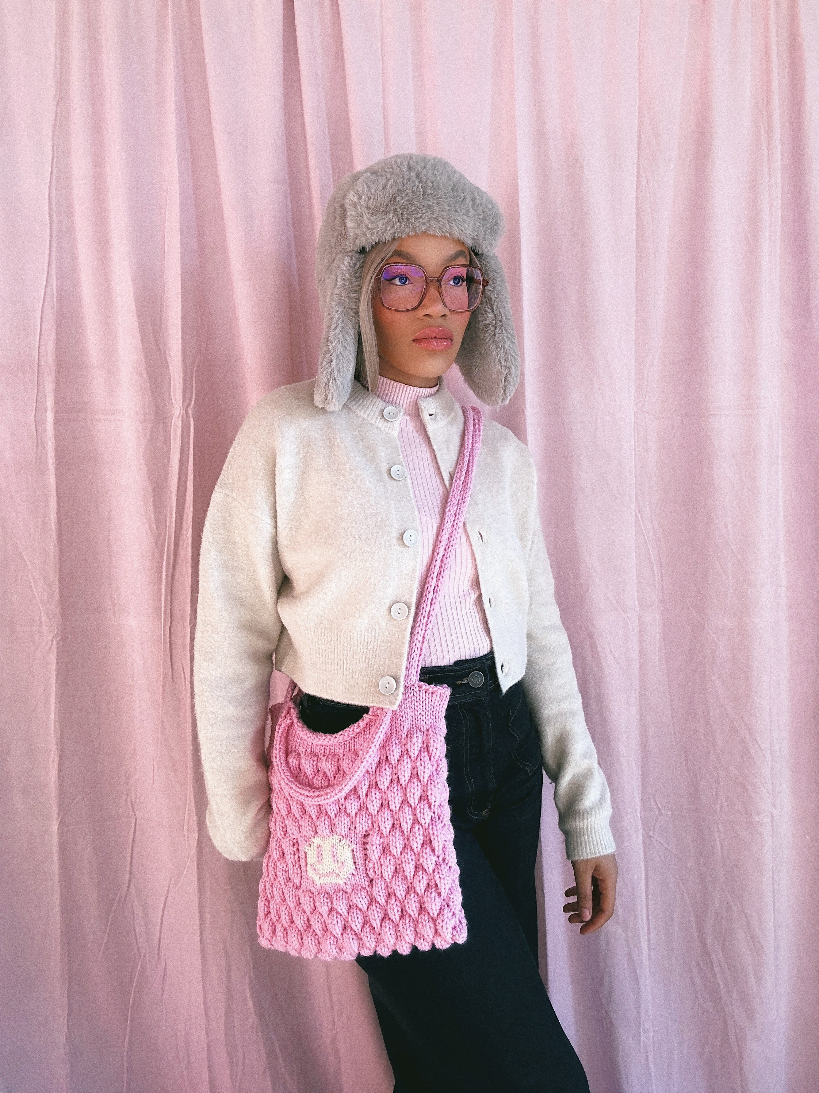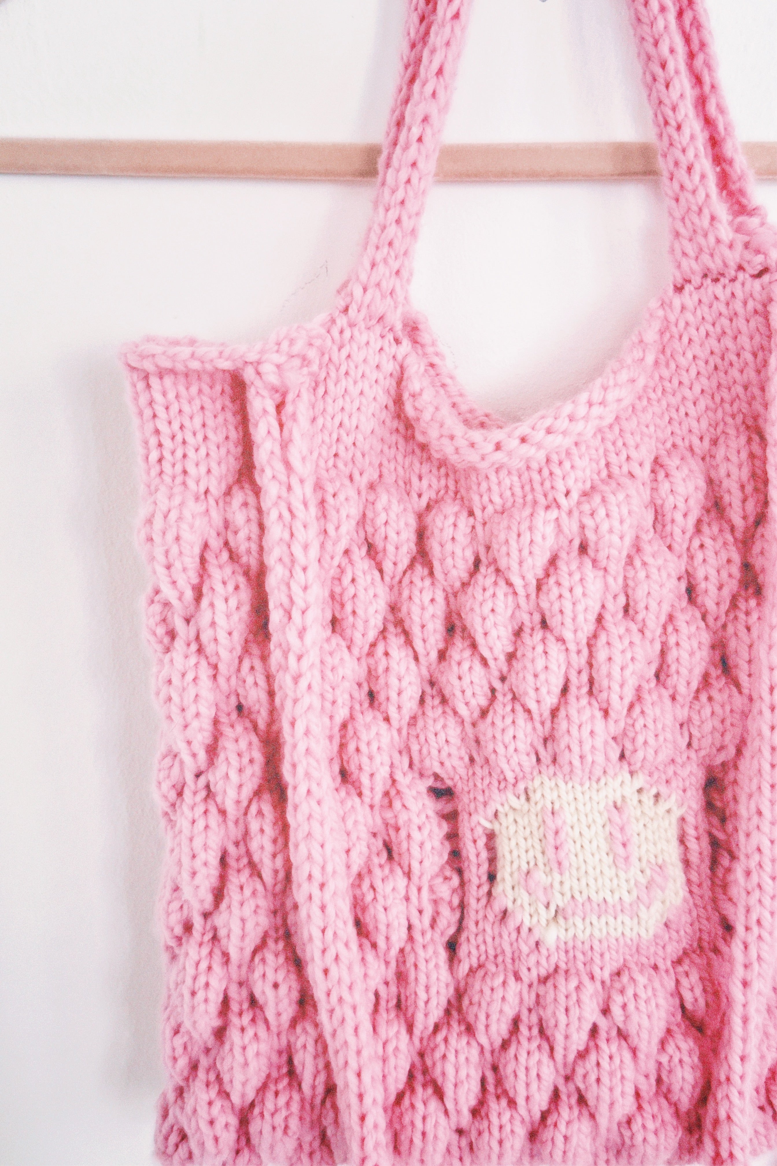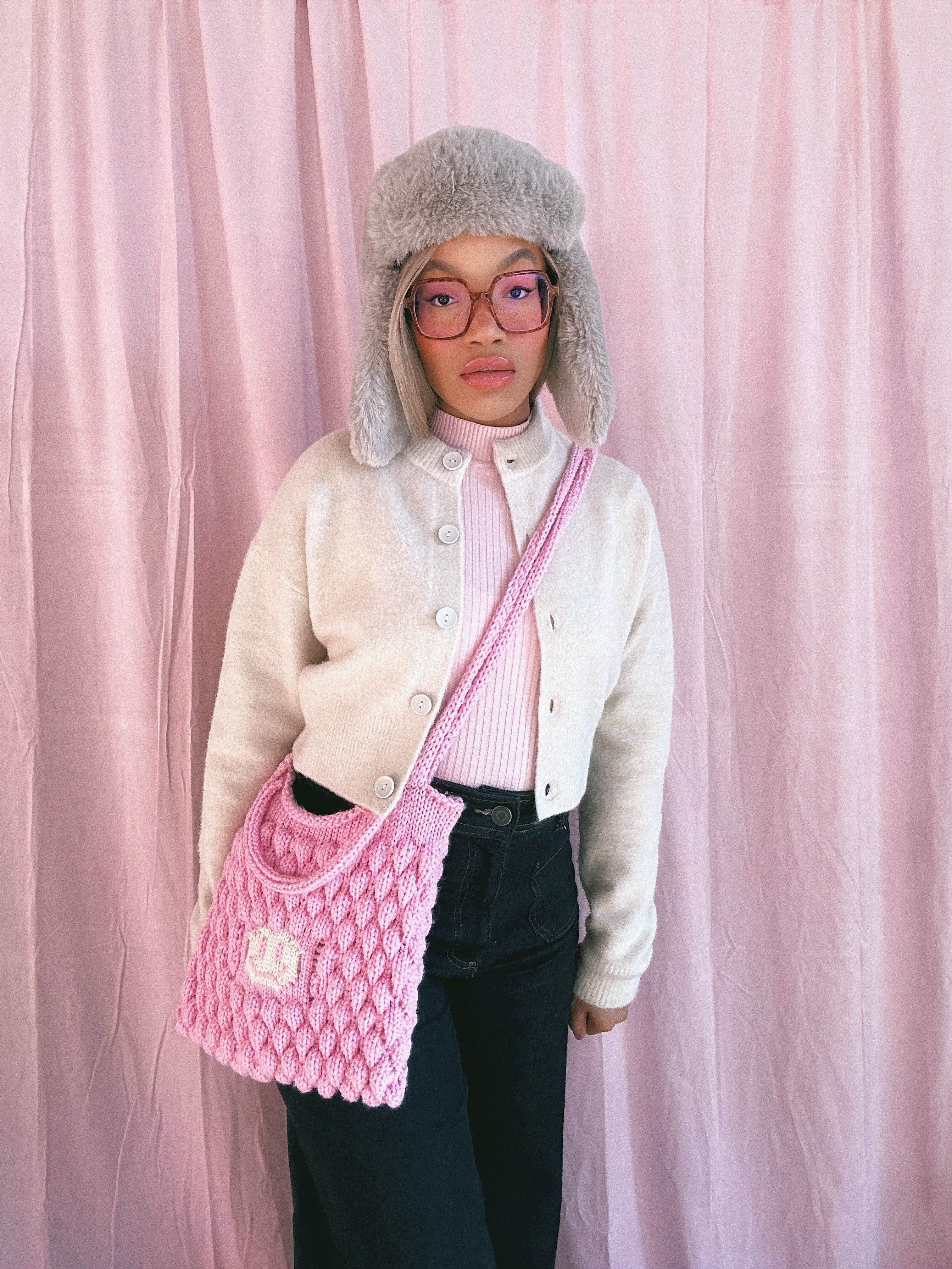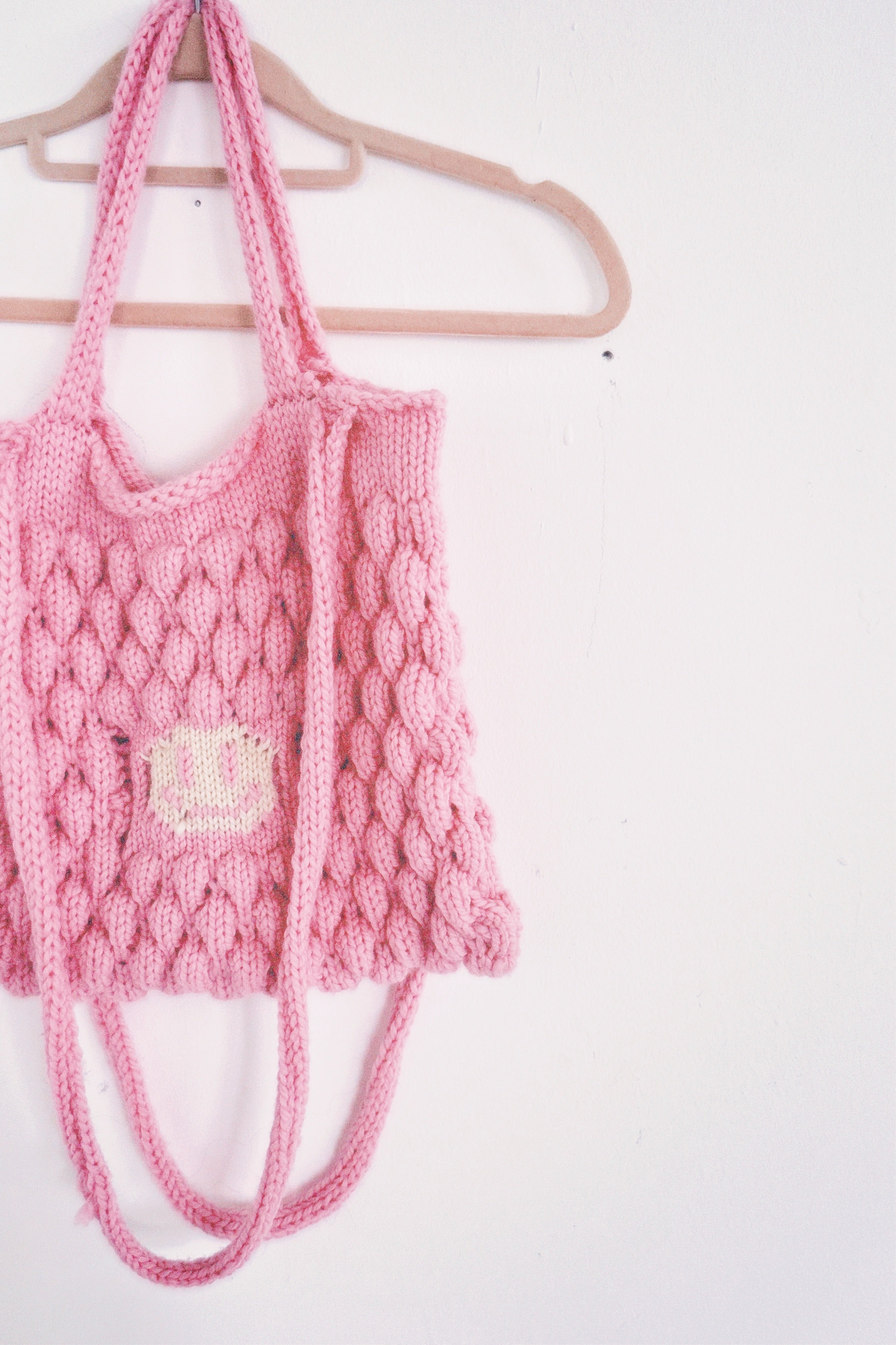 This adorable pink knit tote bag is a delightful blend of style and function, perfect for adding a pop of color to any outfit. Featuring a charming textured pattern and a signature smiley face motif, it radiates cheerfulness and warmth. With sturdy knit handles and an extra-long strap option, this bag offers versatile carrying options for comfort and convenience. Spacious enough for your daily essentials, it’s ideal for errands, casual outings, or even as a stylish accessory for a cozy look. A must-have for those who love playful, unique pieces!