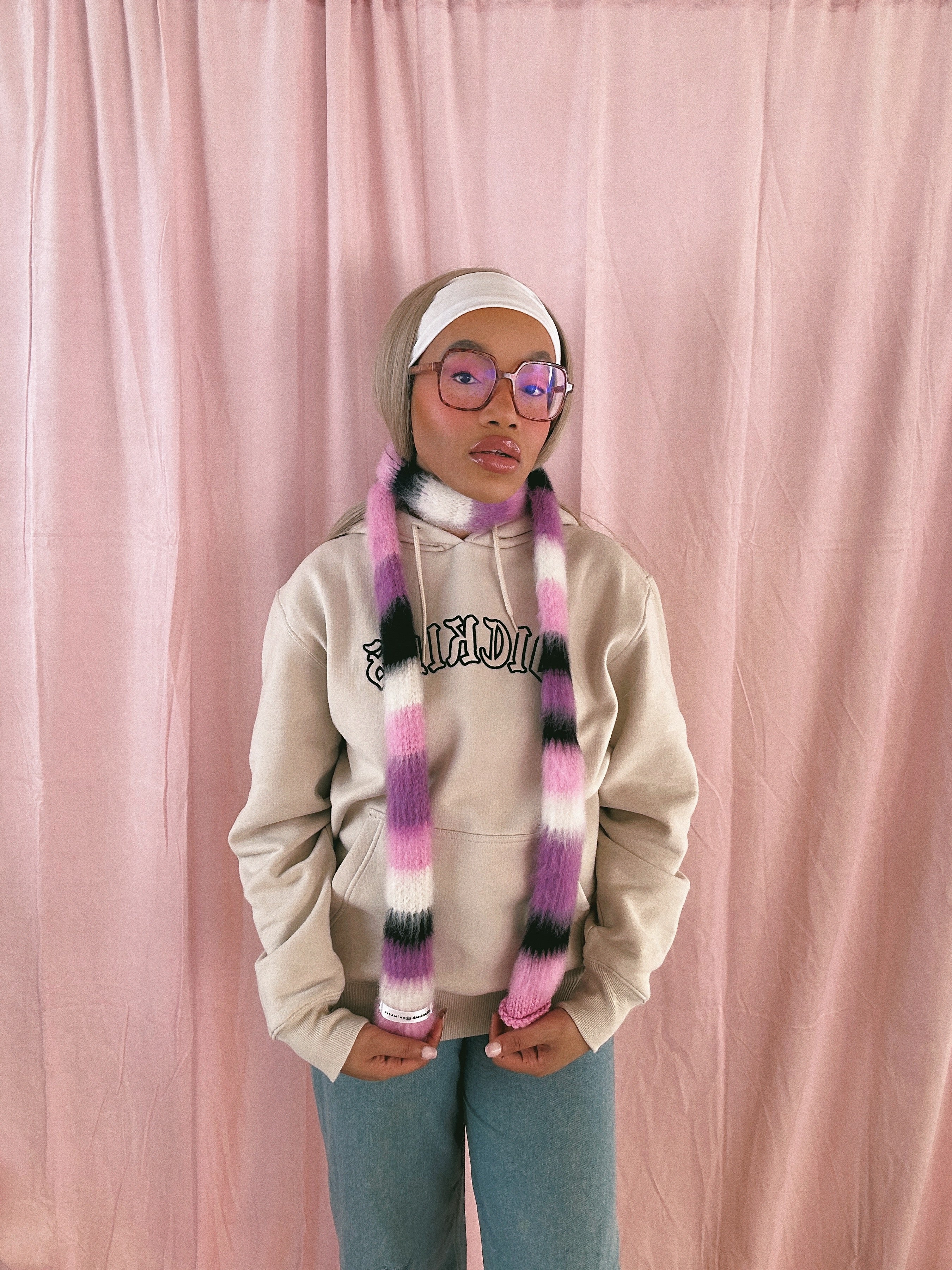 1 OF 1 Pink, Purple, Black and Ivory Skinny Scarf