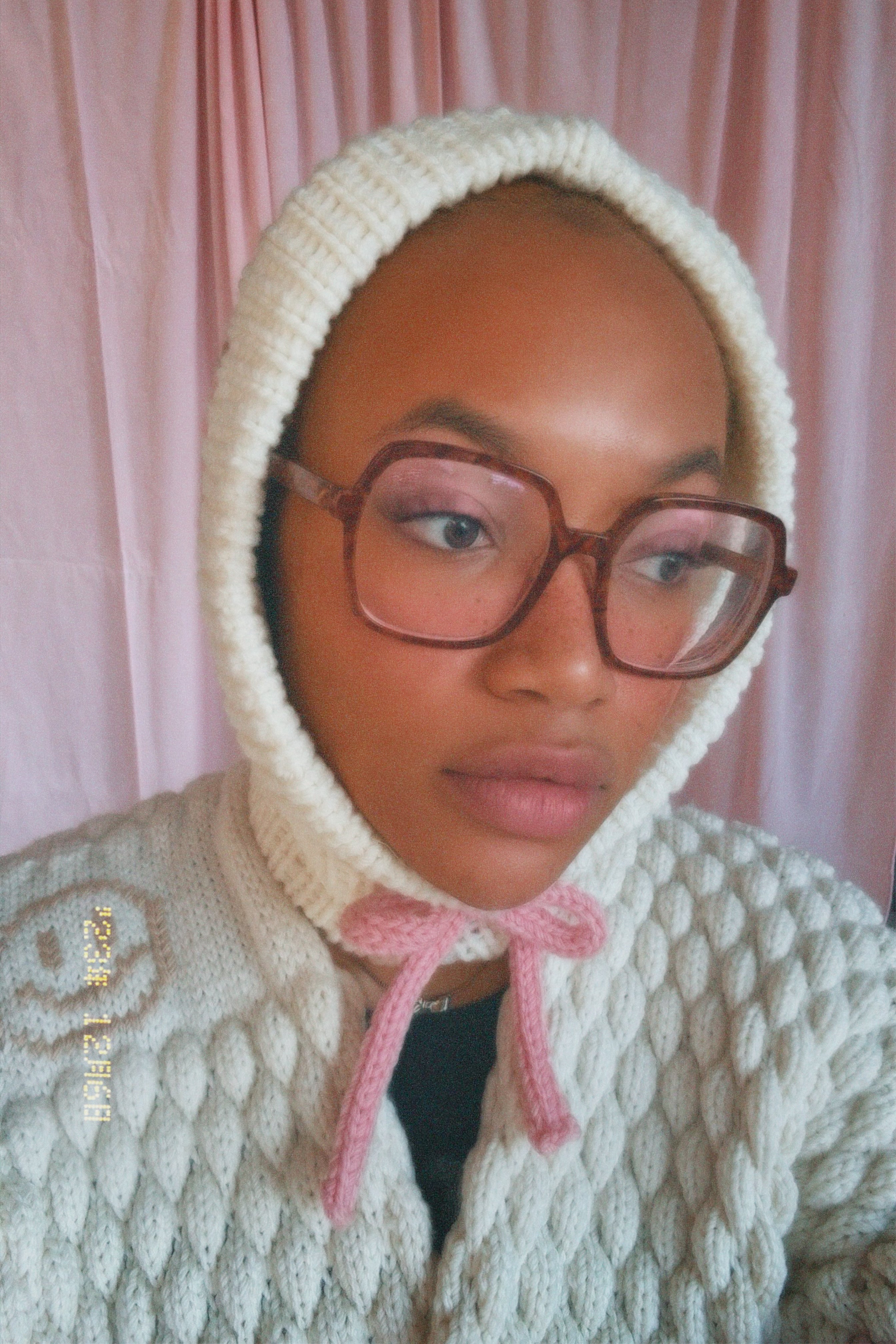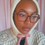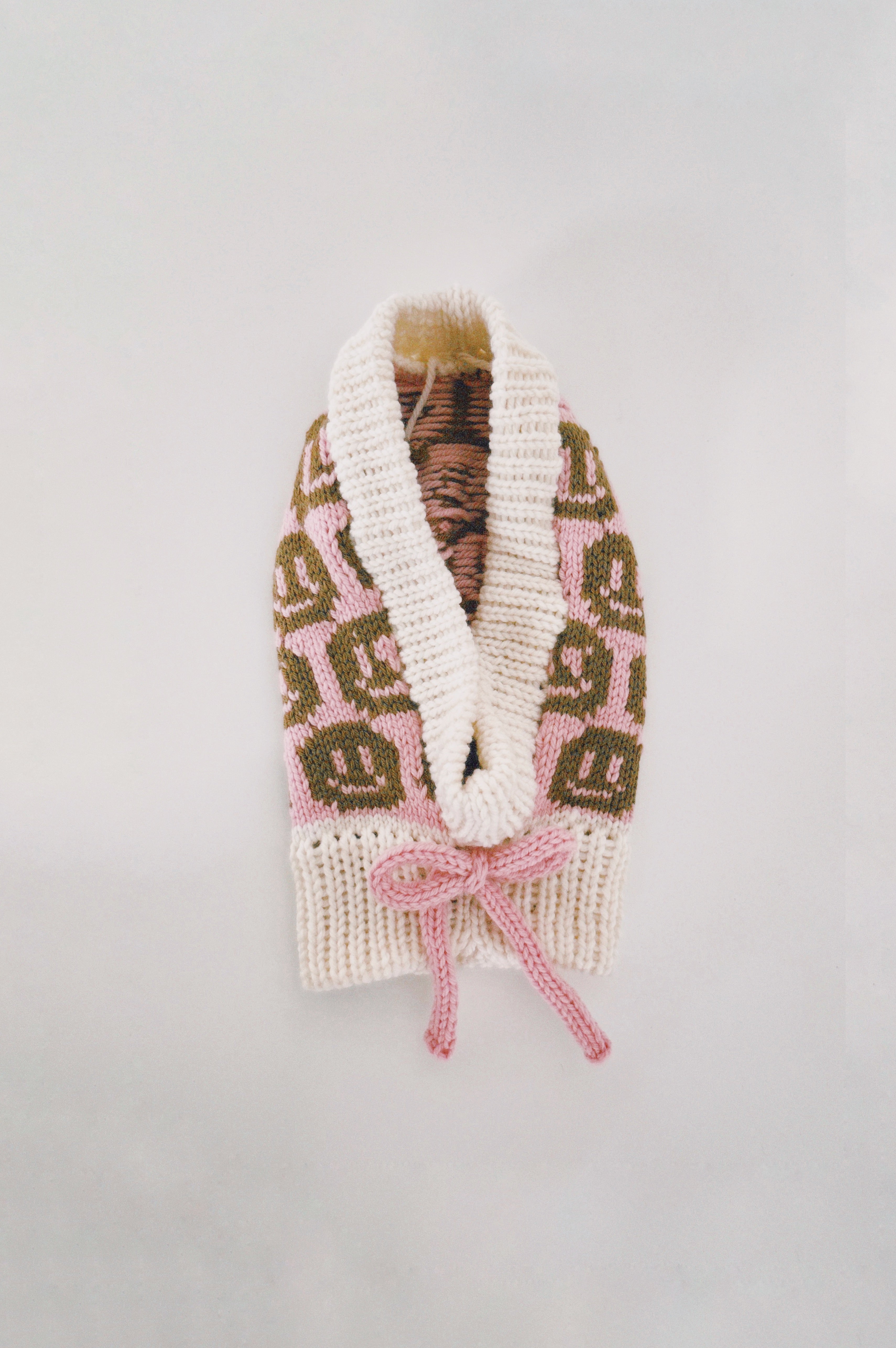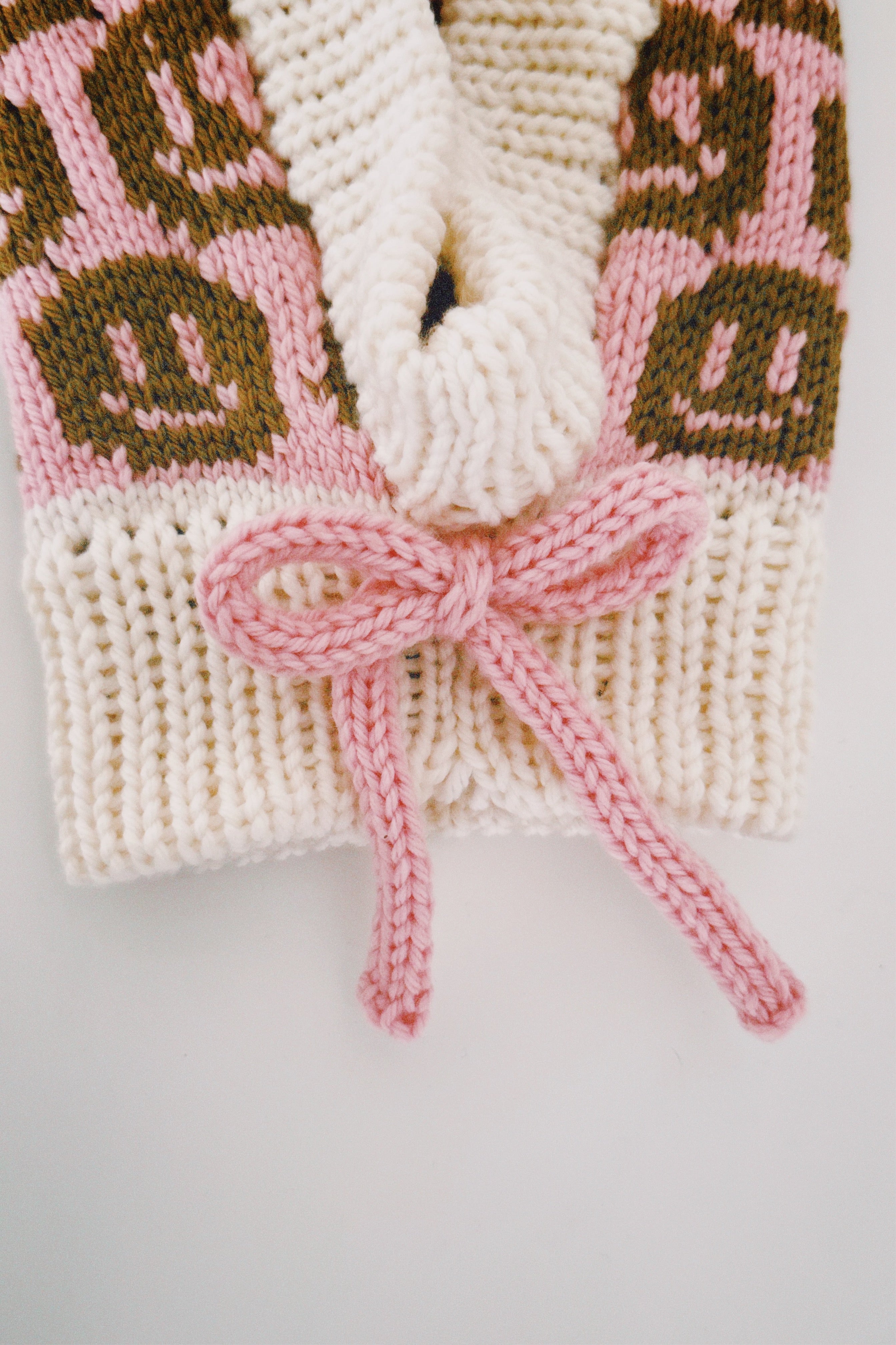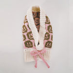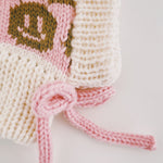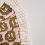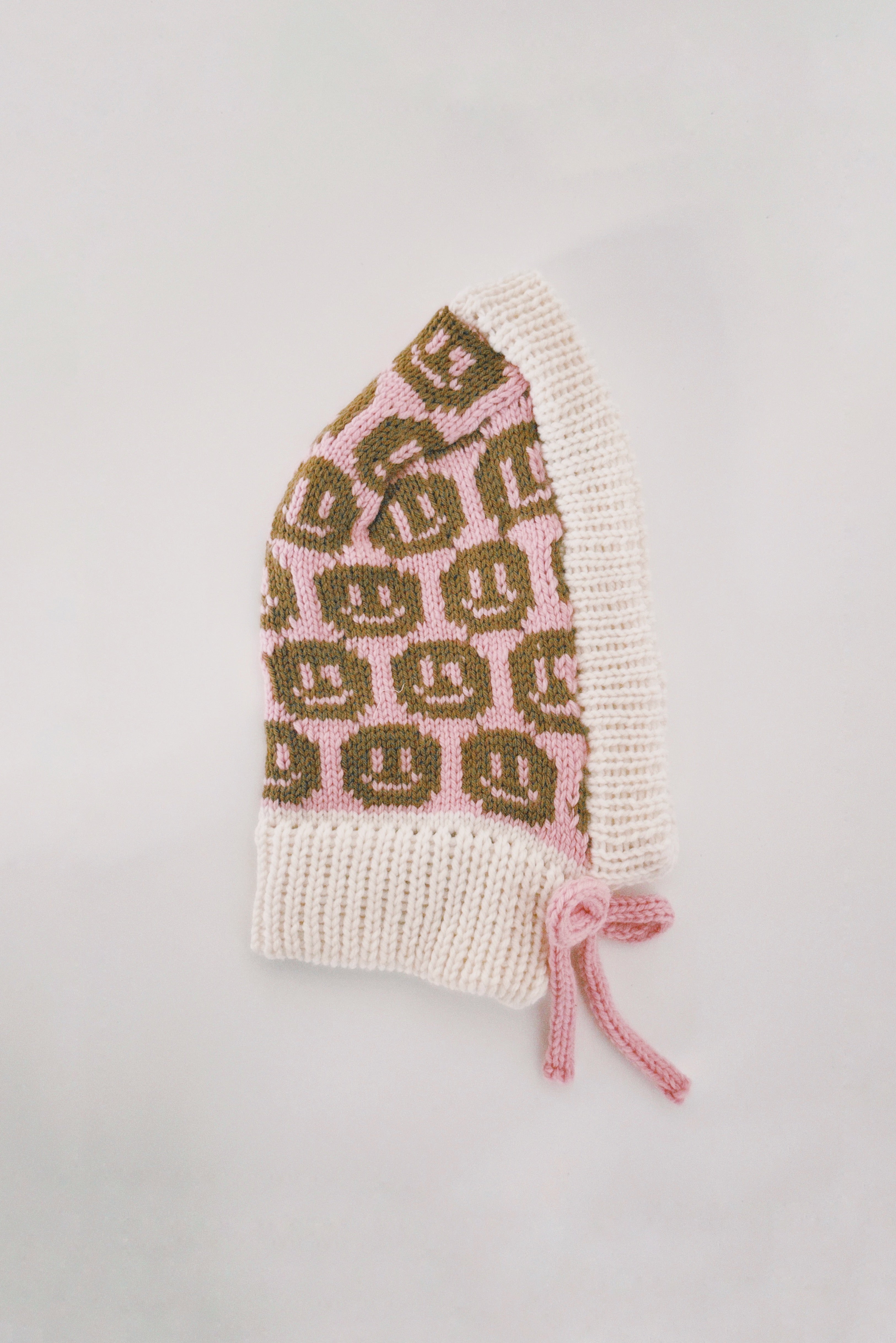 This cozy hooded balaclava is as stylish as it is functional. Featuring a playful pattern of olive-brown smiley faces on a soft pink background, it brings warmth and a touch of whimsy to chilly days. The cream-colored ribbed trim and adjustable tie provide a snug fit, making it perfect for layering over or under jackets. Ideal for adding personality to winter wear, this unique piece combines comfort with a cheerful design that’s sure to brighten up any cold-weather outfit.