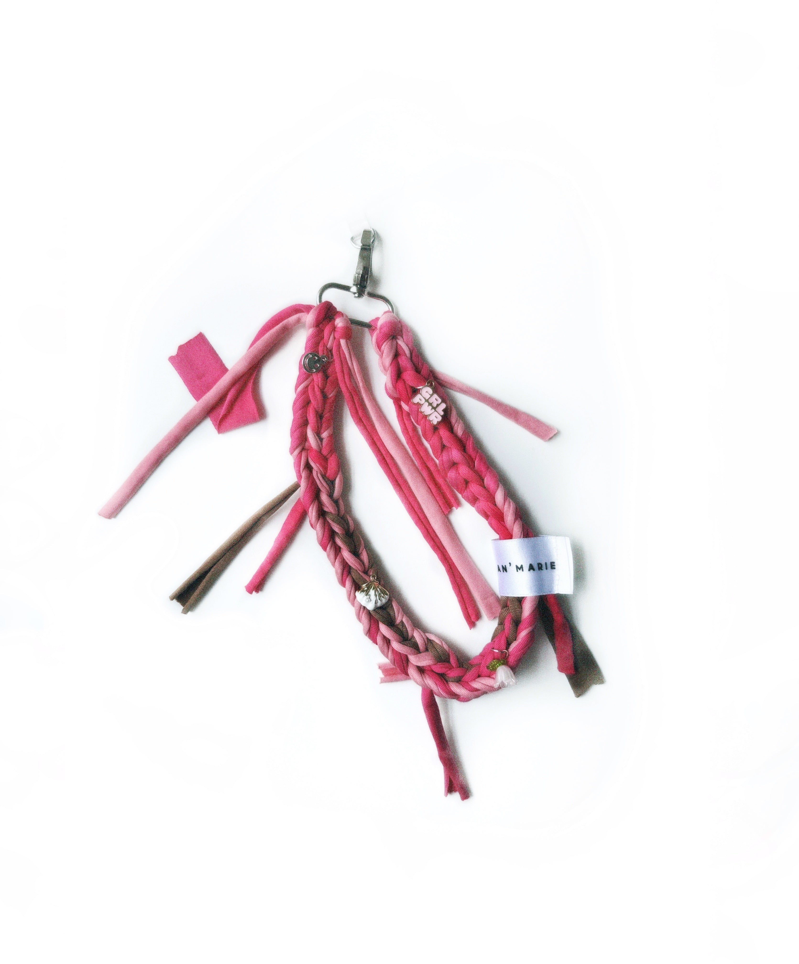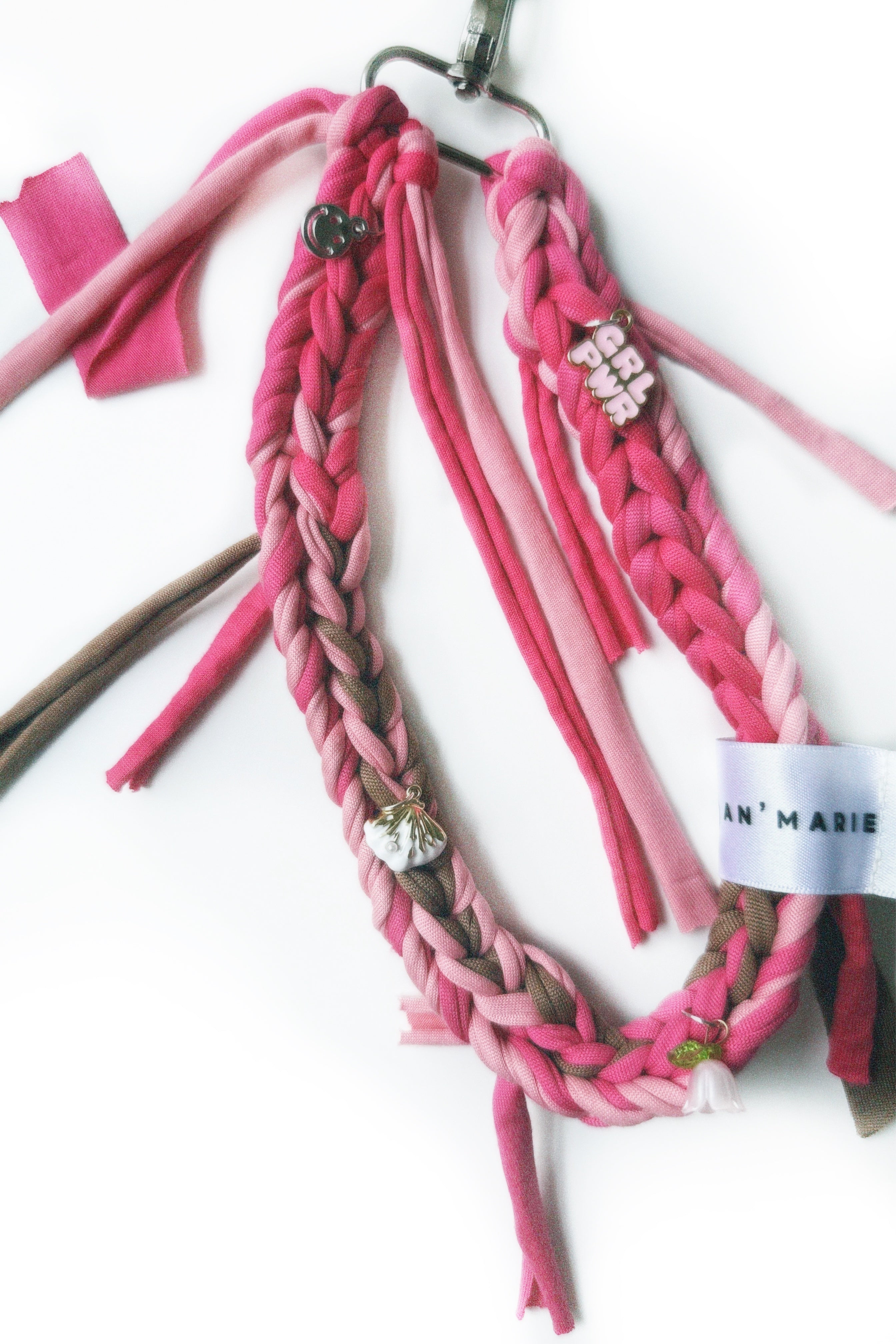 Rich brown tones swirl with rosy pink for a cosy, feminine finish. Berry Mocha is hand-braided with t-shirt yarn and dotted with charms for a subtle sparkle. Perfect for warm neutrals and autumn outfits.