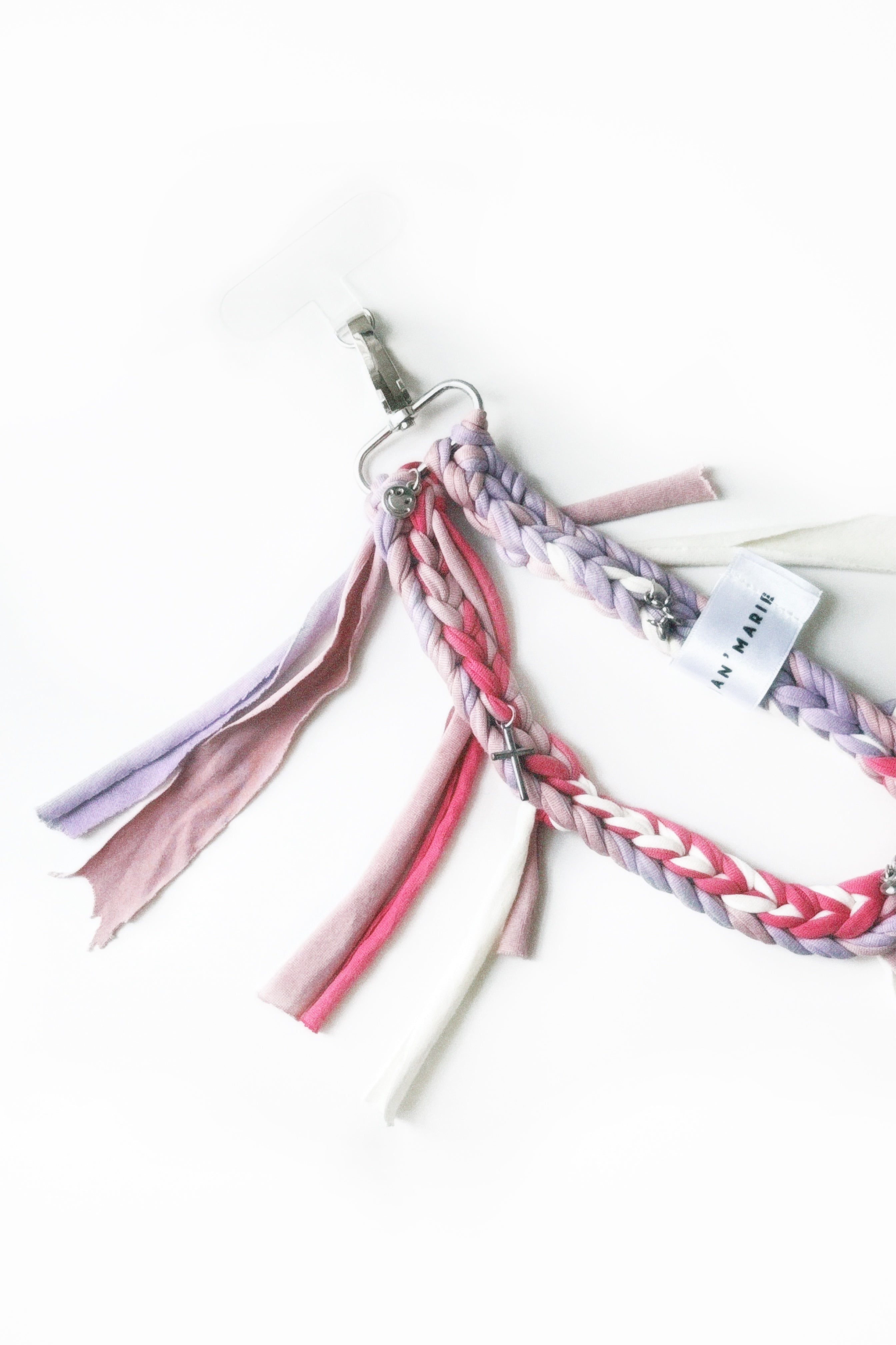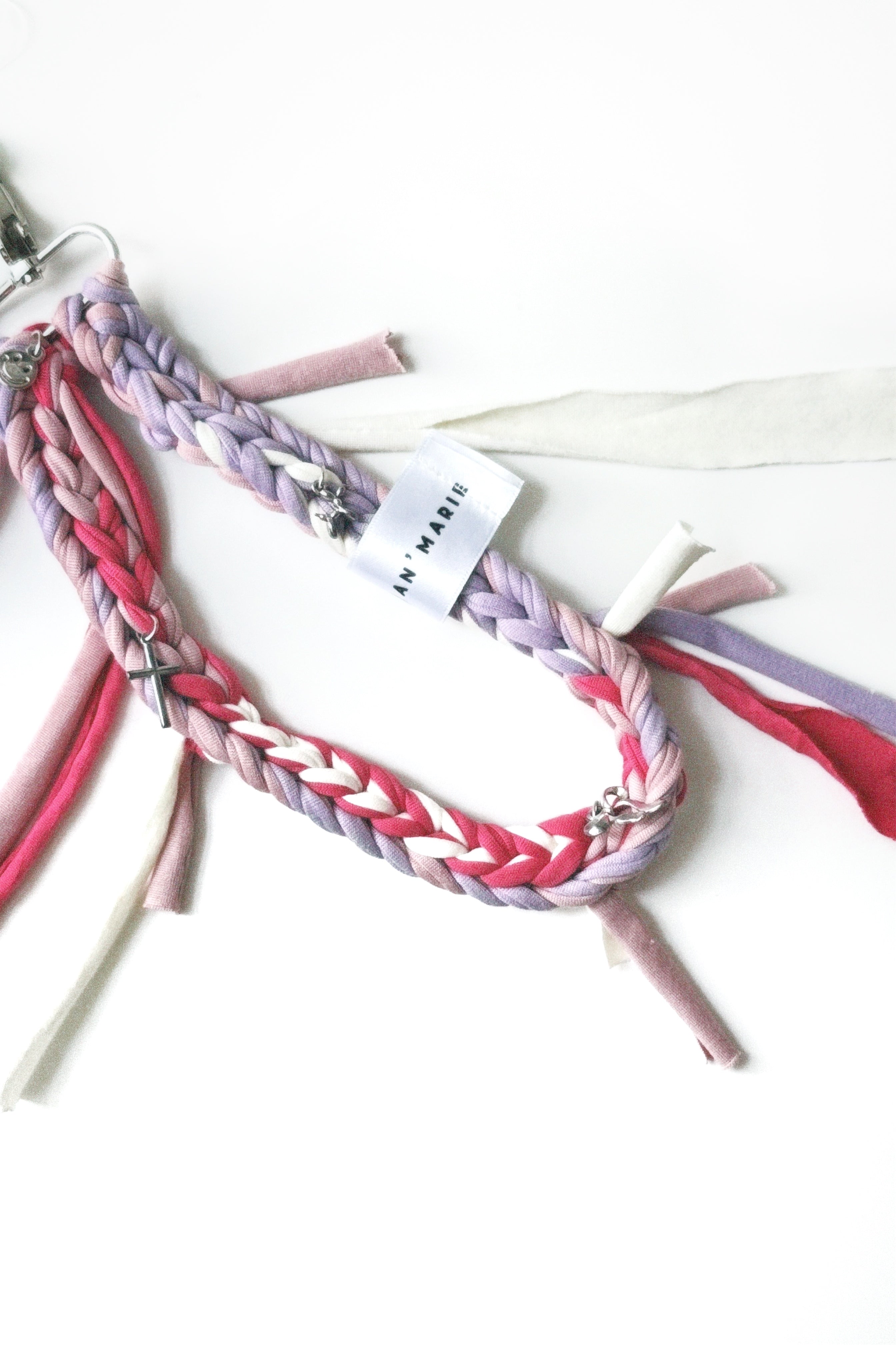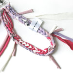 A Dreamy blend of lilac, blush and cream with a playful burst of red. Sugar Plum Pop is hand braided from soft t-shirt yarn and finished with floating tassels and tiny charms. Sweet, pastel and a little bit cheeky. A perfect mix for everyday outfits with pop of colour.